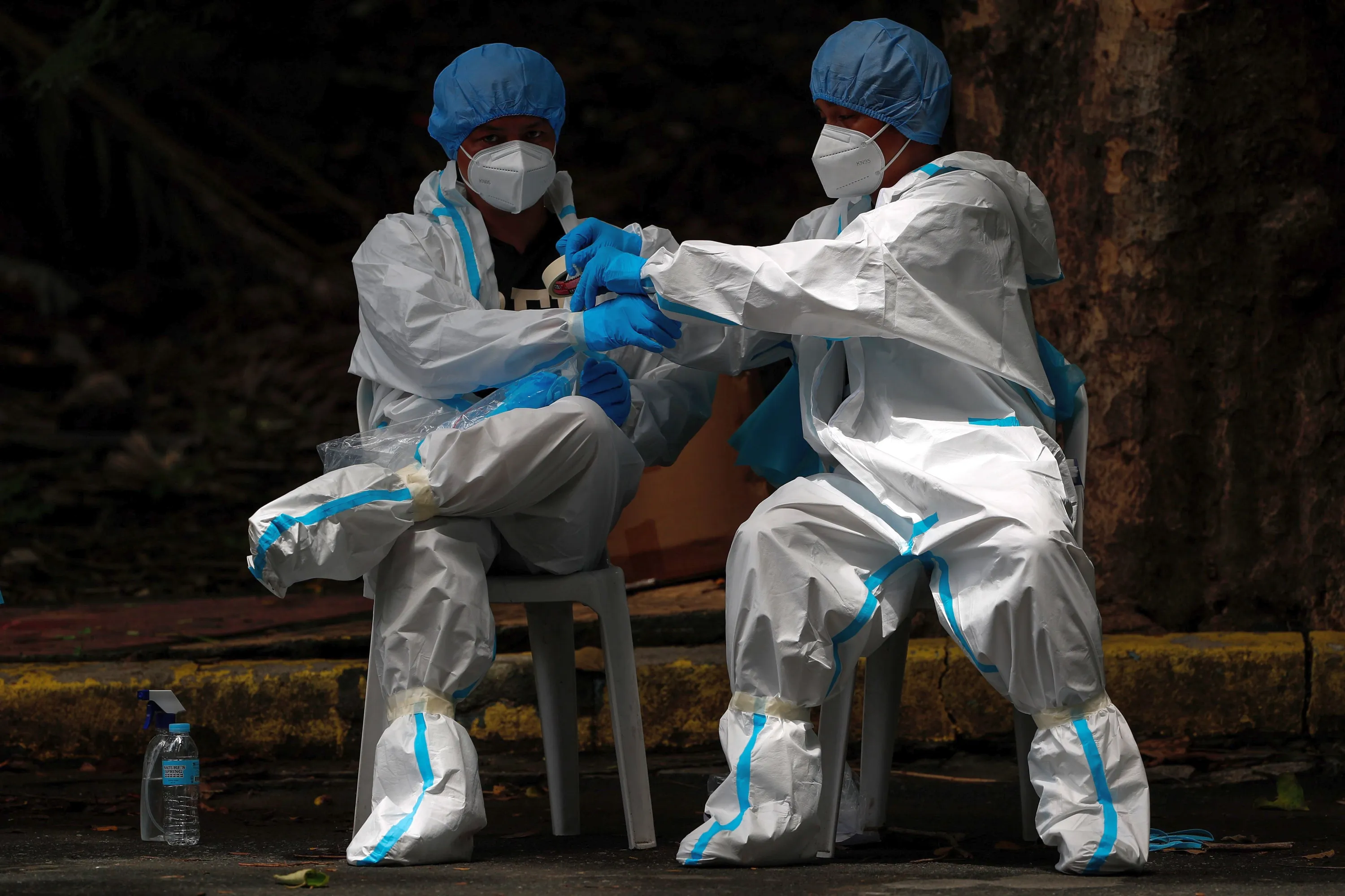 Health workers secure their personal protective equipment (PPEs) before their shift at a swabbing facility in Quezon City, northeast of Manila, Philippines, 30 July 2020. A mass swab test for delivery riders and government workers was held in Quezon City as members of the Inter-Agency Task Force on Emerging Infectious Diseases (IATF-EID) held a press conference discussing how to prevent further spreading of COVID-19 amid the ongoing coronavirus pandemic. (Photo by Mark R. Cristino/EPA/EFE)