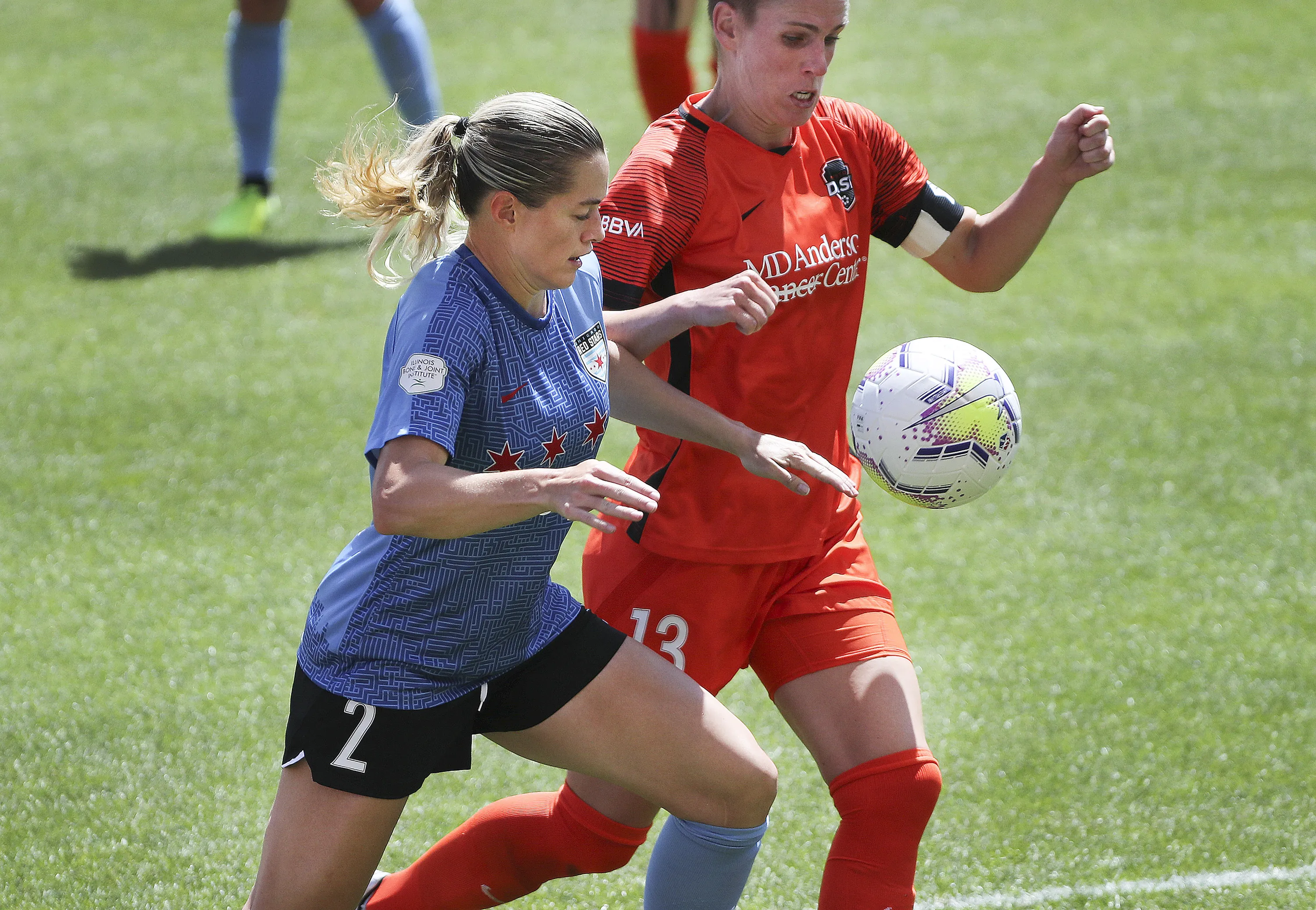 Former Alta Hawk and BYU Cougar and Chicago Red Stars forward Kealia Watt (2) competes with Houston Dash midfielder Sophie Schmidt (13) in the NWSL Challenge Cup at Rio Tinto Stadium in Sandy on Sunday, July 26, 2020. The Houston Dash won the championship. (Photo by Jeffrey D. Allred/Deseret News)