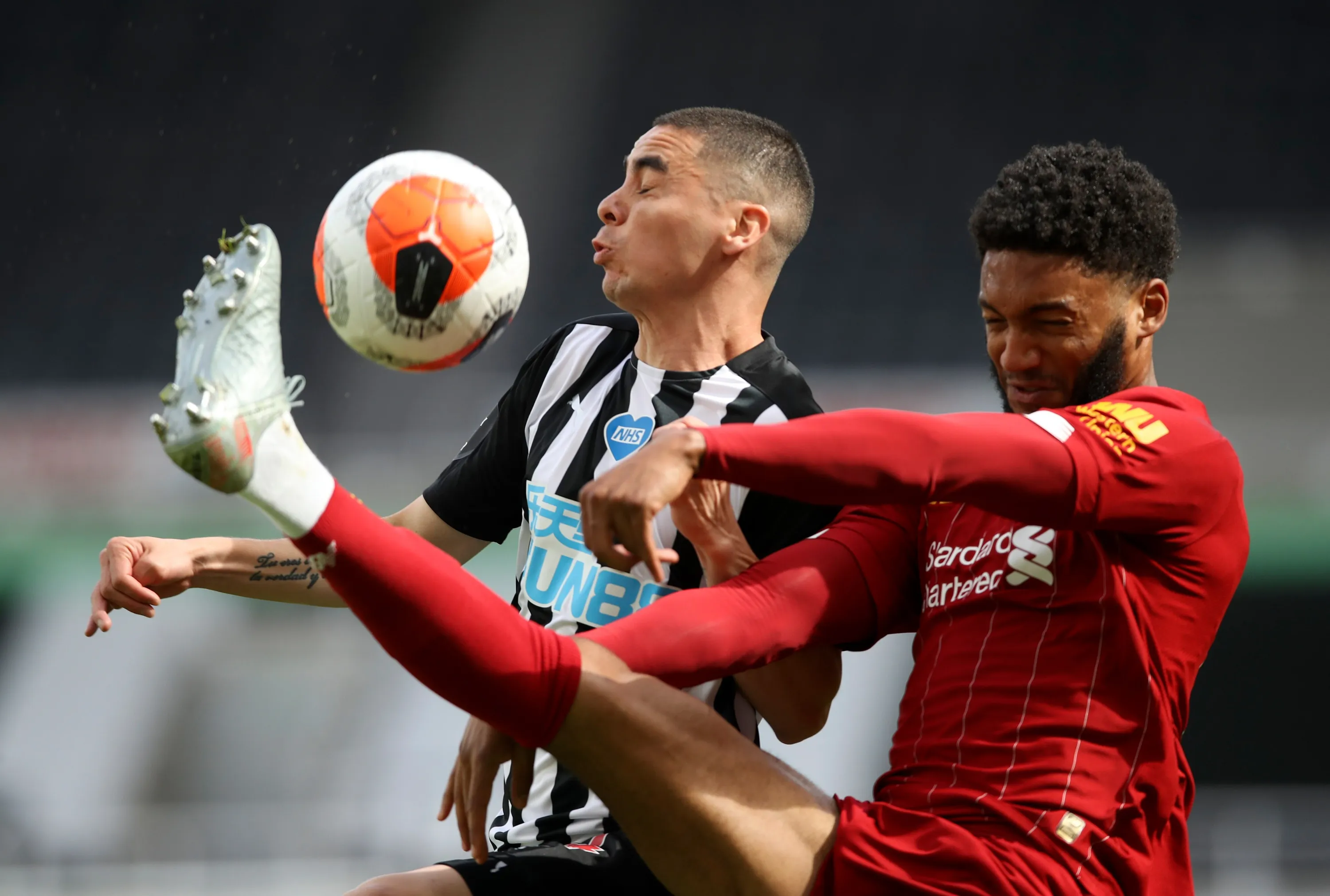 Liverpool's Joe Gomez, right, challenges Newcastle's Miguel Almiron during the English Premier League soccer match between Newcastle and Liverpool at St. James' Park in Newcastle, England, Sunday, July 26, 2020. (Photo by Owen Humphreys/Pool via AP Photo)