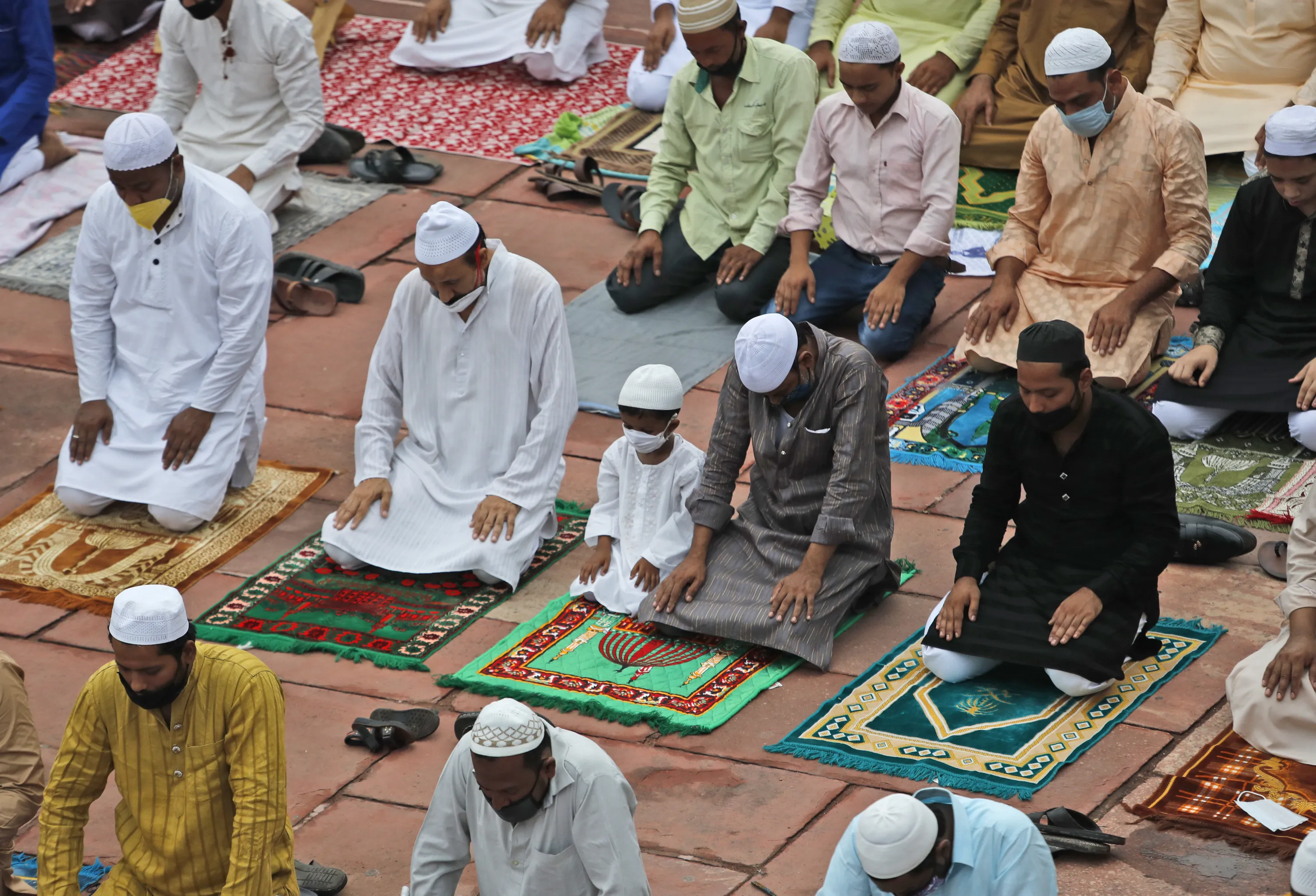 Indian Muslims wear masks as precaution against coronavirus and offer Eid al-Adha prayer at the Jama Masjid in New Delhi, India, Saturday, August 1, 2020. Eid al-Adha, or the Feast of the Sacrifice, by sacrificing animals to commemorate the prophet Ibrahim's faith in being willing to sacrifice his son. (Photo by Manish Swarup/AP Photo)