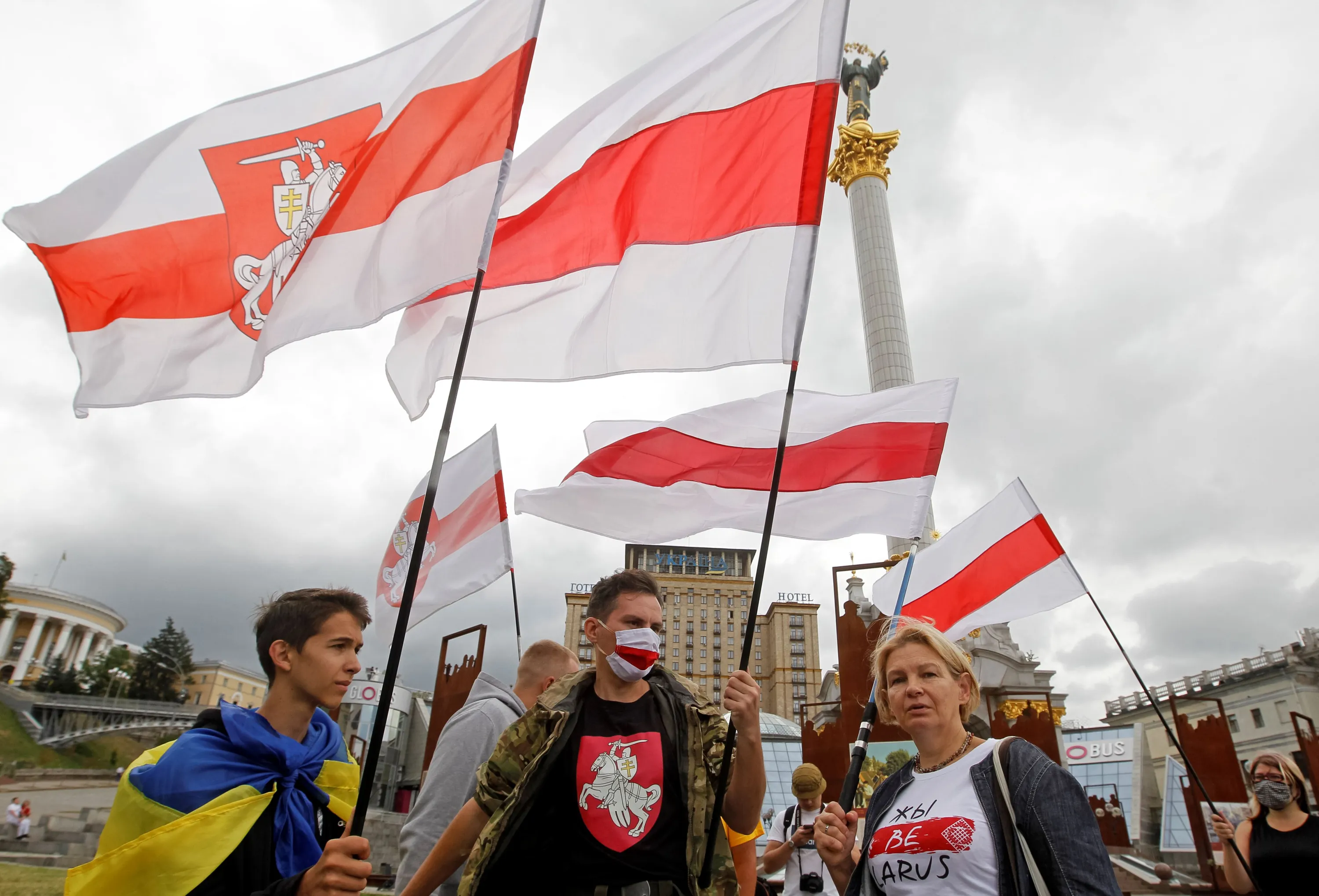 Belarusian activists who living in Ukraine hold Belarusian flags during a rally called “Free Belarus” on the Independence Square in Kyiv, Ukraine, on 01 August, 2020. Belarusian activists held the rally of solidarity with Belarus opposition in the center of Ukrainian capital. The Presidential elections is scheduled in Belarus on 09 August 2020. (Photo by Stringer/NurPhoto via Getty Images)