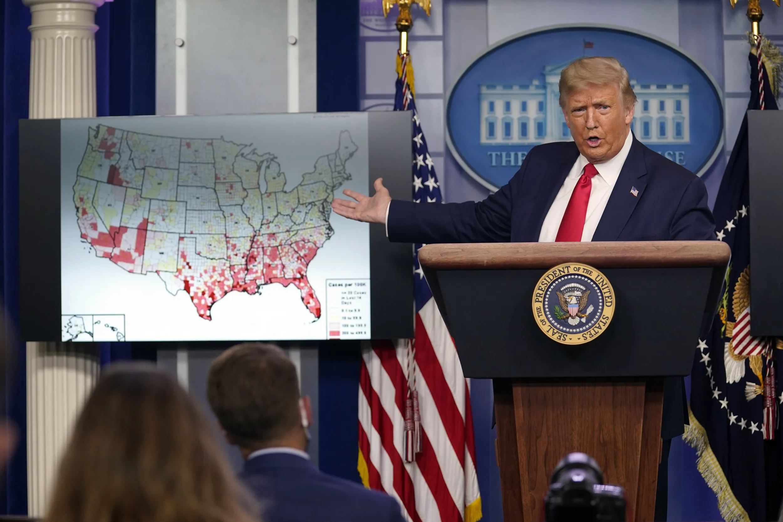 President Donald Trump gestures towards a graphic on the coronavirus outbreak as he speaks during a news conference at the White House, Thursday, July 23, 2020, in Washington. (Photo by Evan Vucci/AP Photo)