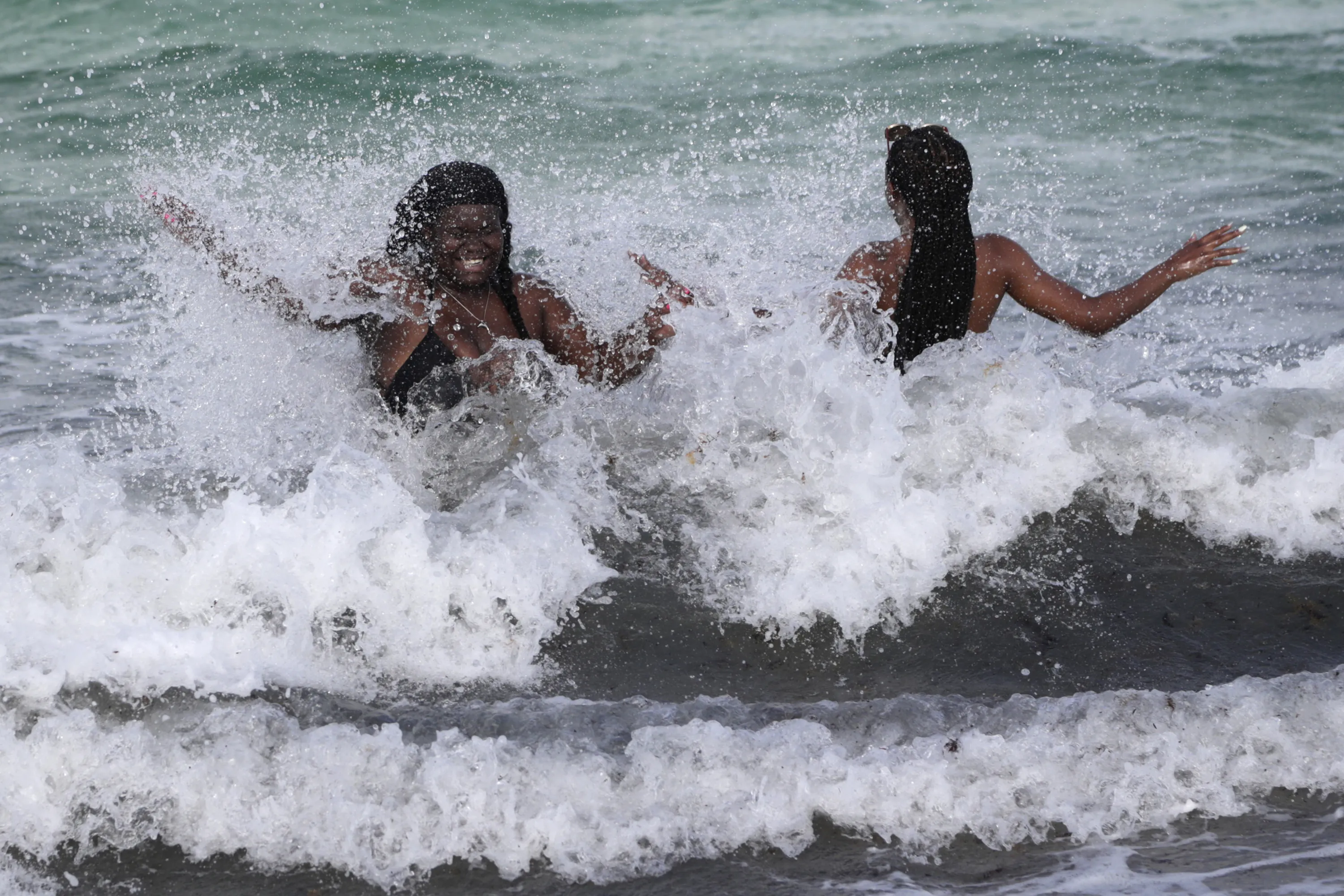 Women enjoy the waves from a high surf, Friday, July 31, 2020, in Miami Beach, Fla. Forecasters declared a hurricane warning for parts of the Florida coast Friday as Hurricane Isaias drenched the Bahamas on track for the U.S. East Coast. (Photo by Lynne Sladky/AP Photo)
