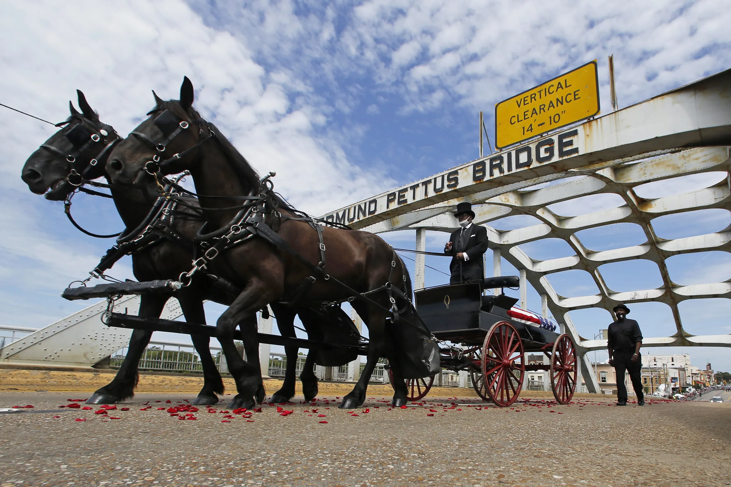 The casket of Rep. John Lewis moves over the Edmund Pettus Bridge by horse drawn carriage during a memorial service for Lewis, Sunday, July 26, 2020, in Selma, Ala. Lewis, who carried the struggle against racial discrimination from Southern battlegrounds of the 1960s to the halls of Congress, died Friday, July 17, 2020. (Photo by John Bazemore/AP Photo)