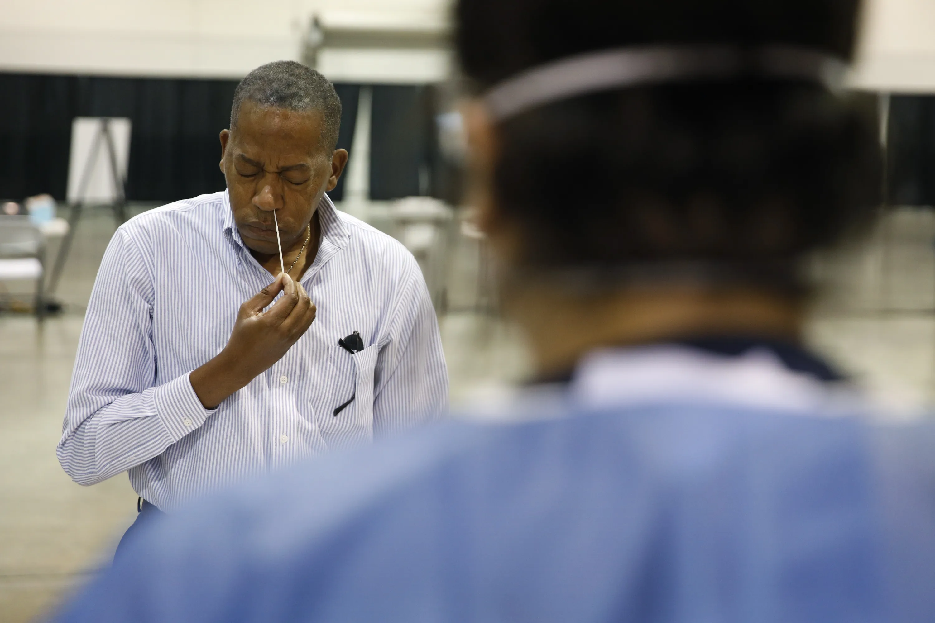 Clark County Commission Vice Chairman Lawrence Weekly swabs his nose while giving a coronavirus test to himself during a tour of setup at a temporary coronavirus testing site Monday, August 3, 2020, in Las Vegas. (Photo by John Locher/AP Photo)