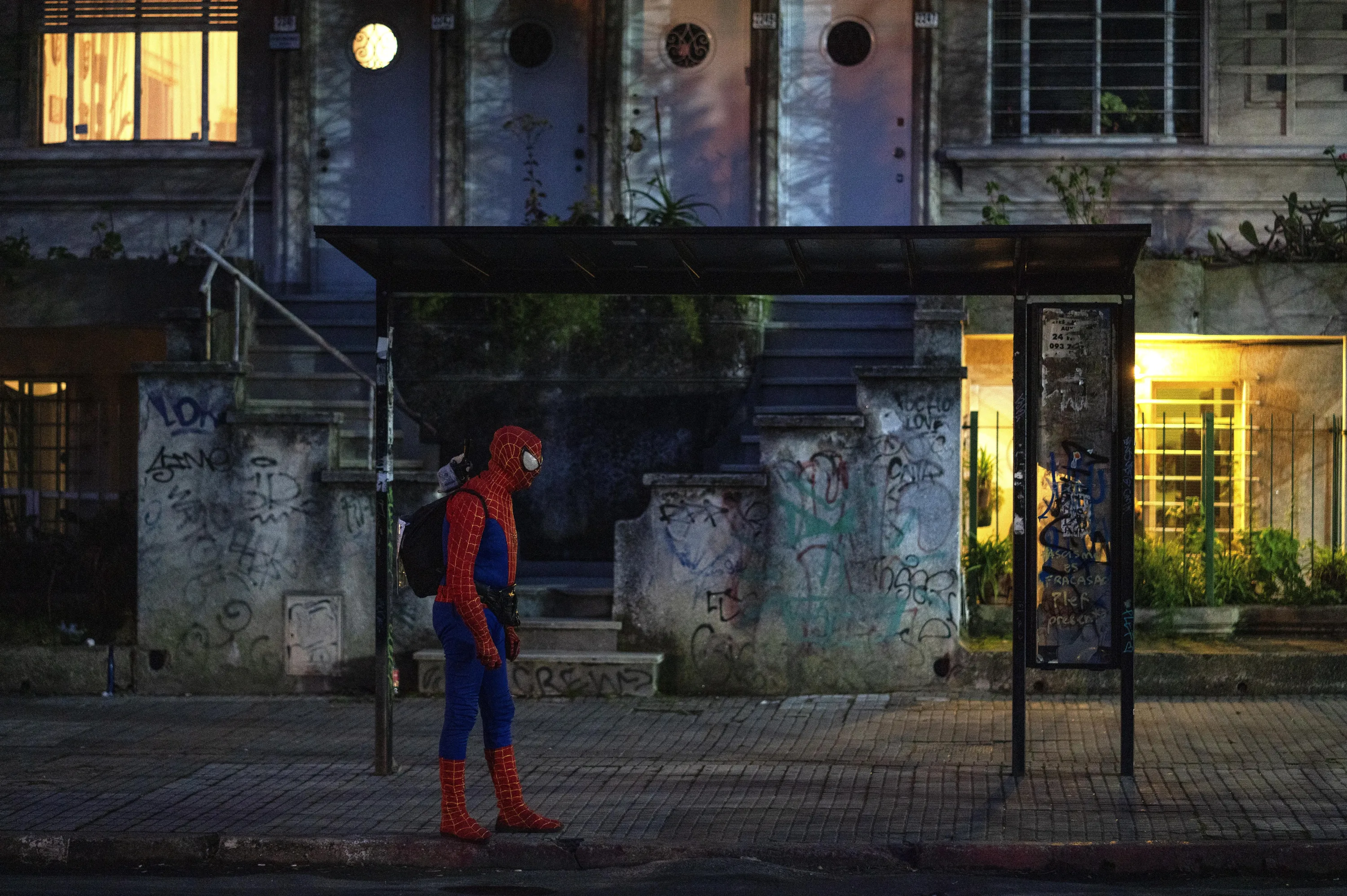 A man wearing a Spiderman costume waits for the bus amid the new coronavirus pandemic in Montevideo, Uruguay, Sunday, August 2, 2020. After more than four months closed due to measures to curb the spread of the new coronavirus, cinemas, museums and theaters will re-open in Uruguay Monday, with social distancing protocols. (Photo by Matilde Campodonico/AP Photo)