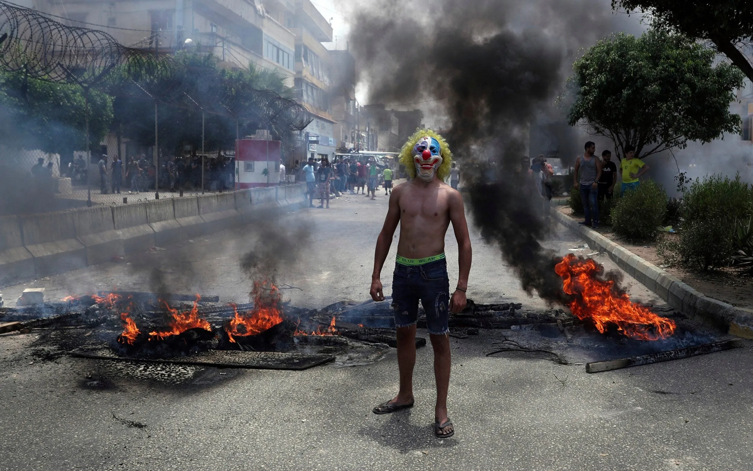 An anti-government demonstrator poses with a clown mask as others burn tires and wood to block a road in Beirut, Lebanon, Tuesday, July 14, 2020. Trash has been piling up in different parts of Lebanon recently as no deal has been reached between the government and waste management companies over payments for their employees. Most workers at the companies are foreigners and want to get paid in U.S. dollars. Lebanon is witnessing shortage in hard currency and the Lebanese pound has lost more than 80% of its value in recent months. (Photo by Bilal Hussein/AP Photo)