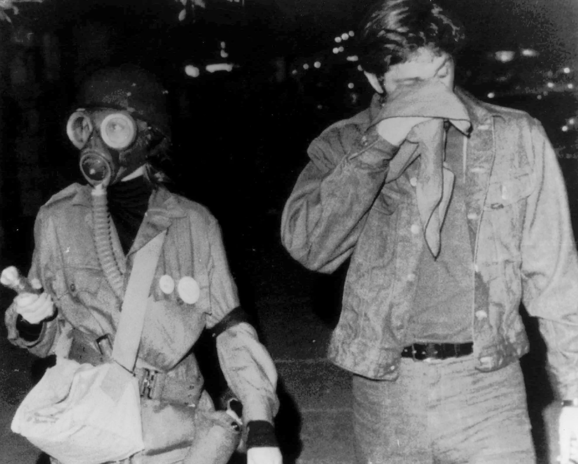 In this August 27, 1968, file photo, a woman wears a gas mask as she walks with a companion holding a cloth to his eyes after they were sprayed with tear gas during protests on Chicago's North Side. The Associated Press found that there is no government oversight of the manufacture and use of tear gas. Instead, the industry is left to regulate itself. (Photo by AP Photo/File)
