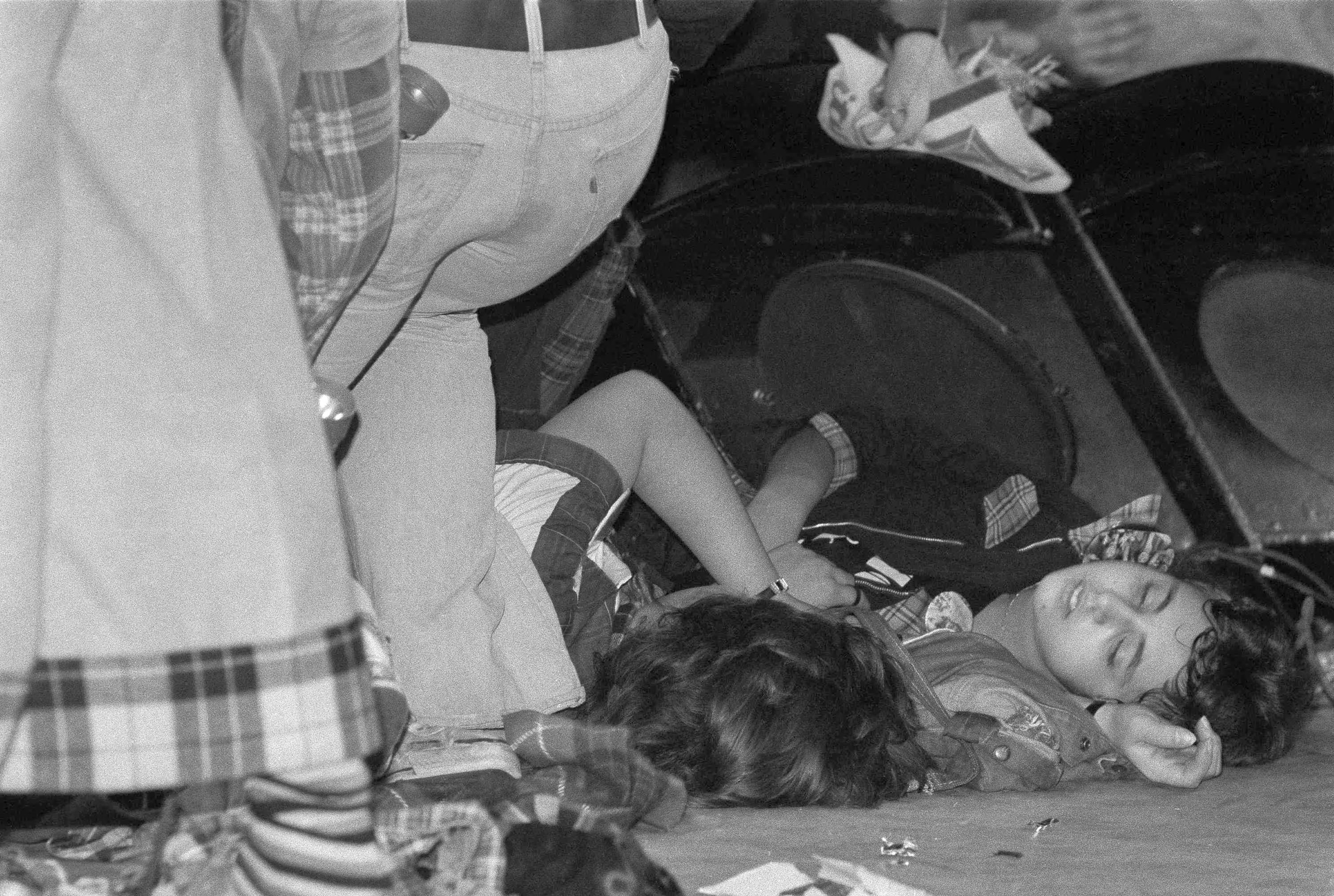 Teenage girls lie on stage at New York�s Palladium Theatre on Saturday, January 9, 1977, after being crushed in the surging crowd at the Bay City Rollers� New York debut. The extent of their injuries is unknown. Thousands of teenagers crushed toward the stage as the Scottish pop band performed. (Photo by Charles Kenneth Lucas/AP Photo)