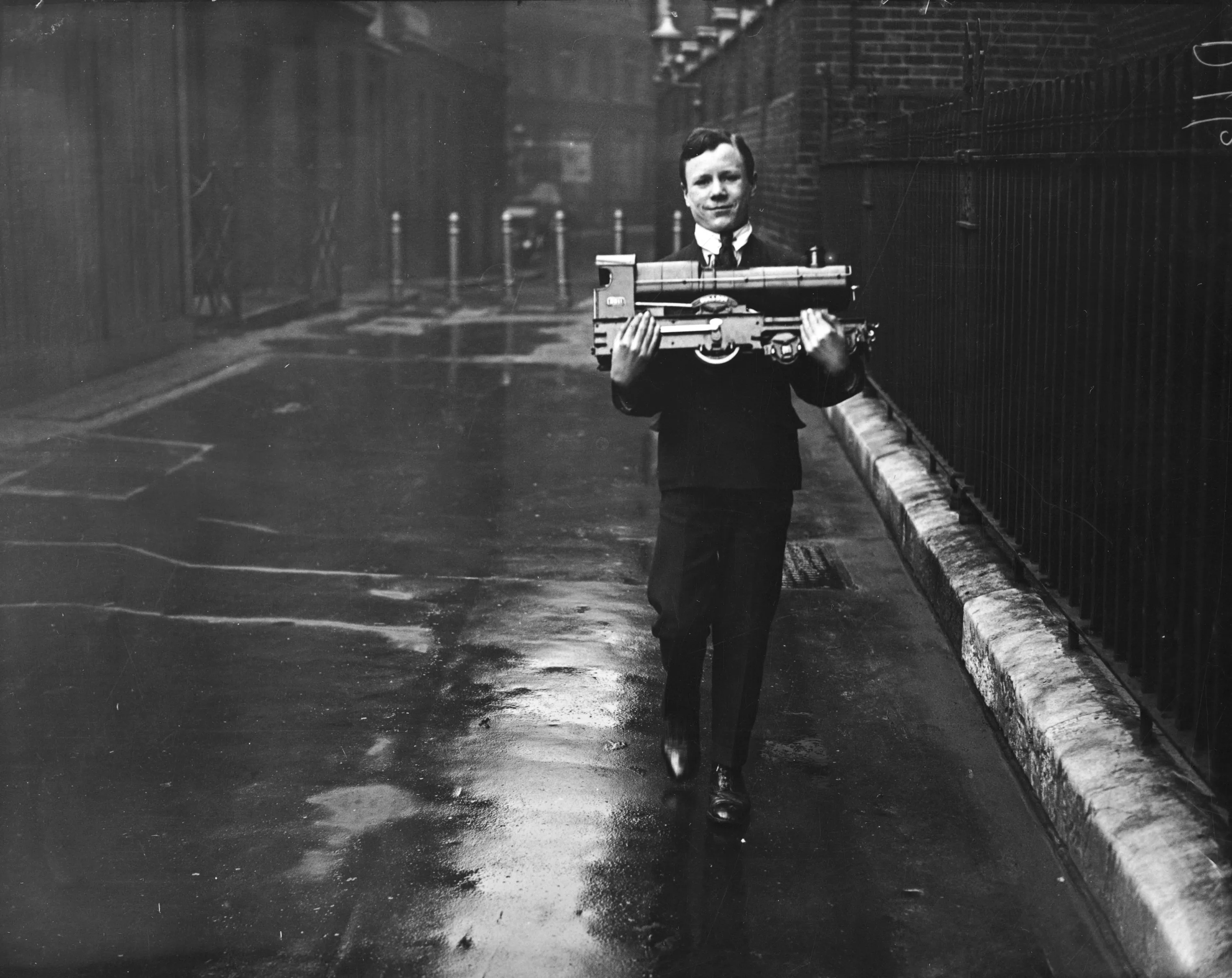 An exhibitor arriving at Kingsway Hall for the annual model engine show, 17th April 1928. (Photo by H. F. Davis/Topical Press Agency/Getty Images)