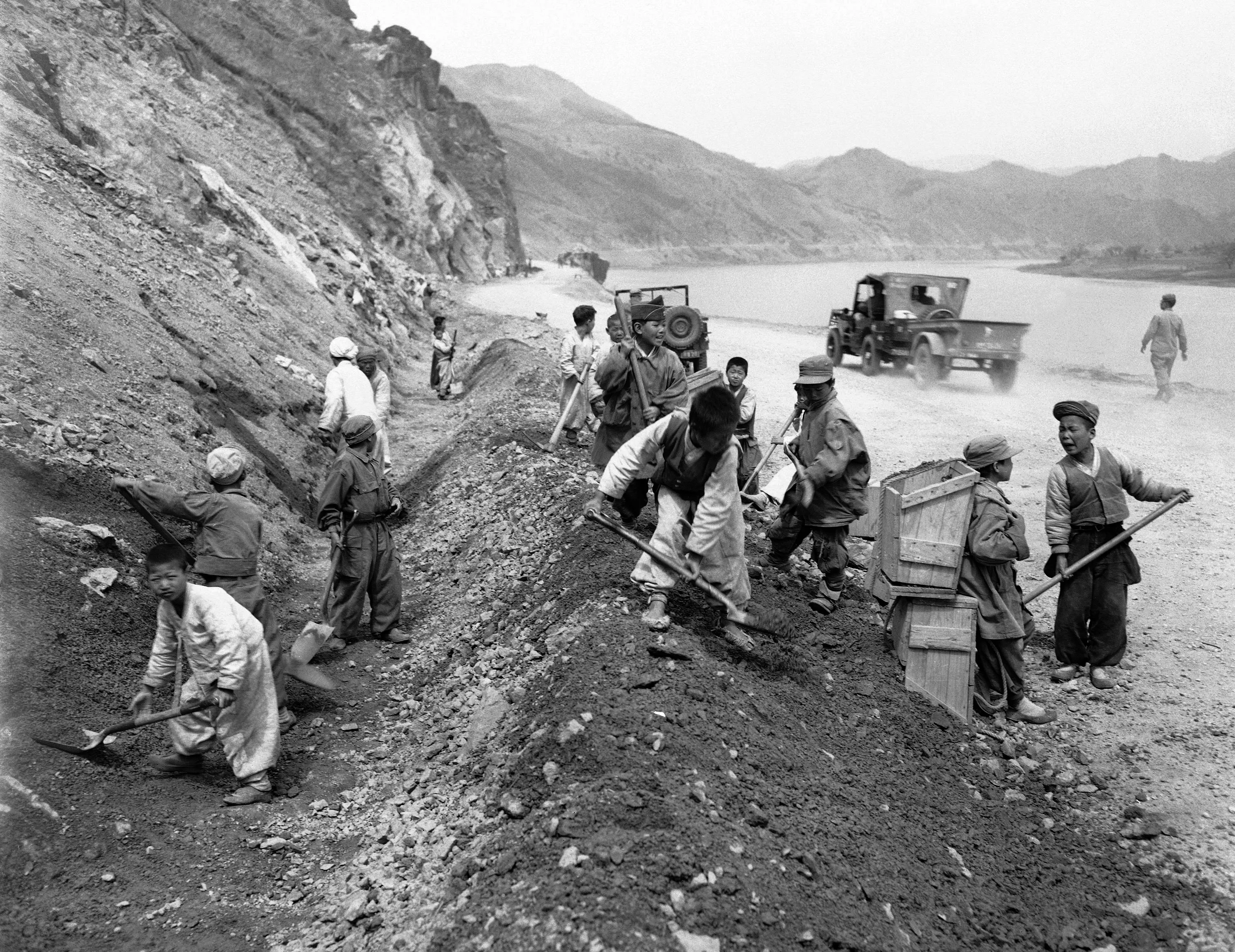 Wearing ill-fitting clothes, some of GI origin, these young Koreans aid in road repair on April 25, 1942. Youngster at right appears to be having difficulty with a co-worker who holds box-like contraption on his back. This box is filled with dirt and operates by opening hinged boom with rope carried over the shoulders. When dirt has been carried to desired location, the hinged bottom is lowered and the dirt settles where needed. (Photo by Gene Smith/AP Photo)