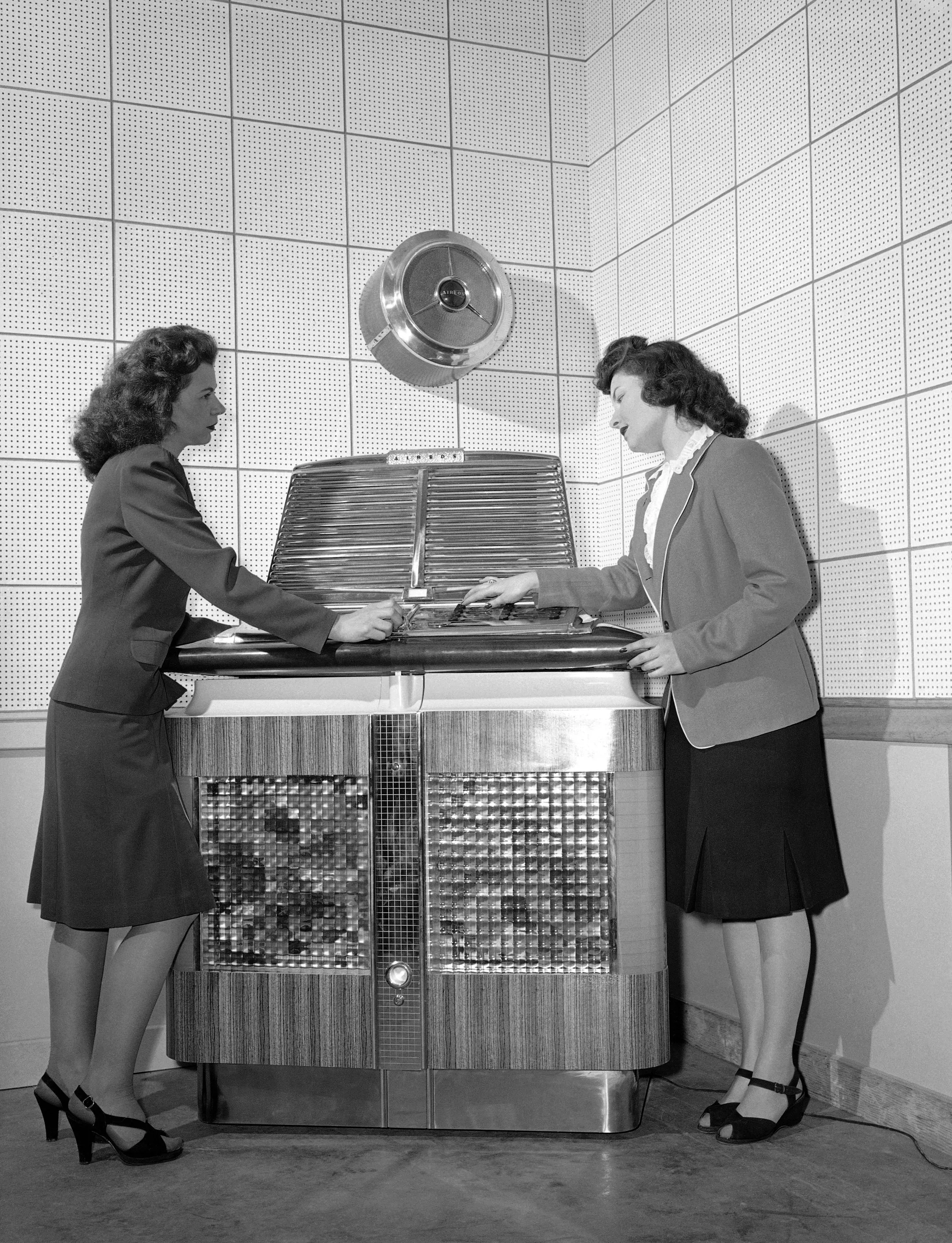 Vera Fidler, left, and Peddy Duffin of the office staff select a number on one of the new electronic phonographs just off the assembly line at the plant in Kansas City, Kansas, April 27, 1946. While on a rest period, the ladies act as testers for the new juke boxes. (Photo by AP Photo)
