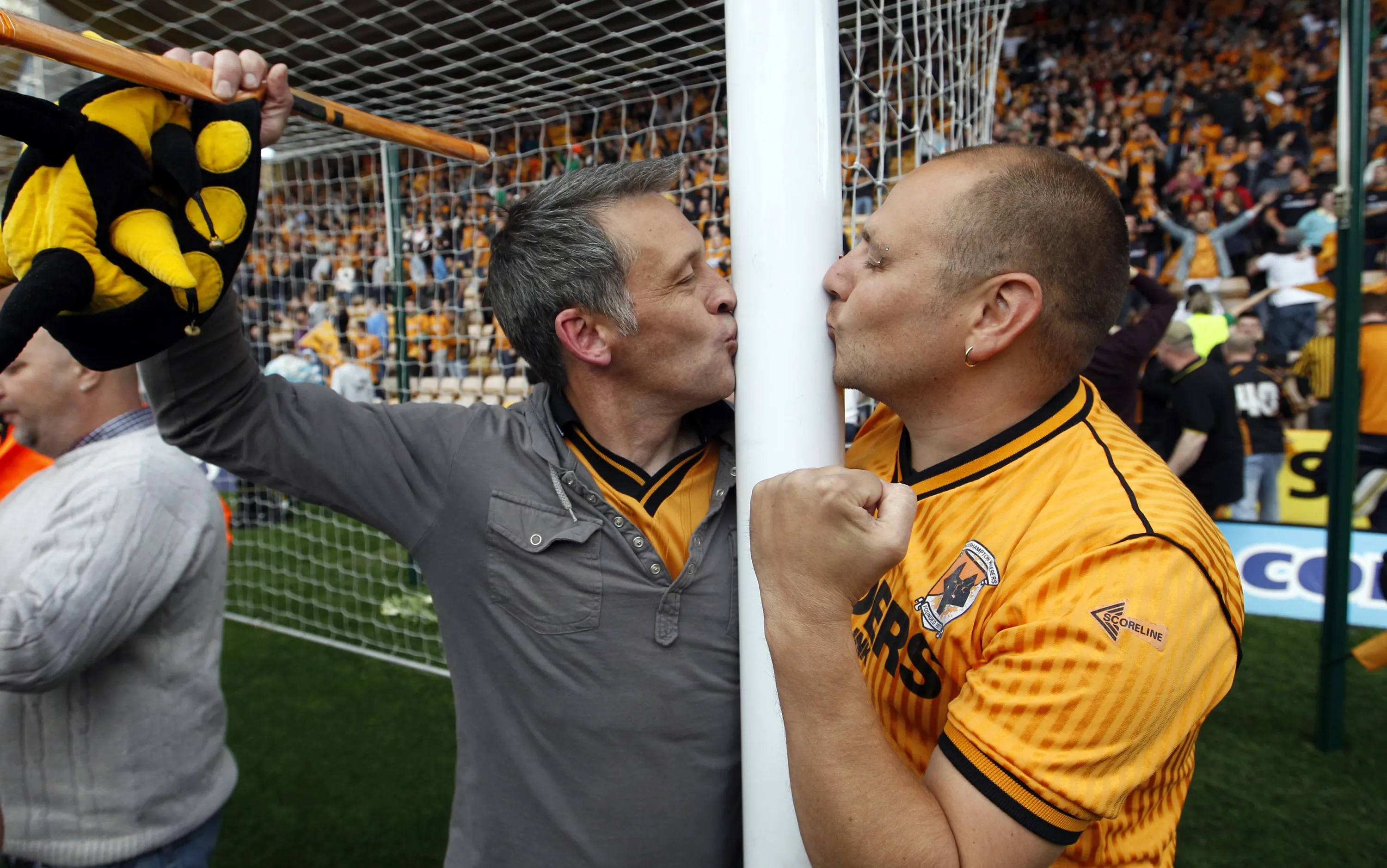 Wolverhampton Wanderer fans kiss the goal post after their English Premier League soccer match against Blackburn Rovers at the Molineux stadium in Wolverhampton, May 22, 2011. Wolves avoided relegation despite coming from 3-0 down to lose 3-2 to Blackburn, a defeat that was celebrated as if they had won the league and also secured Blackburn's safety. (Photo by Andrew Winning/Reuters)