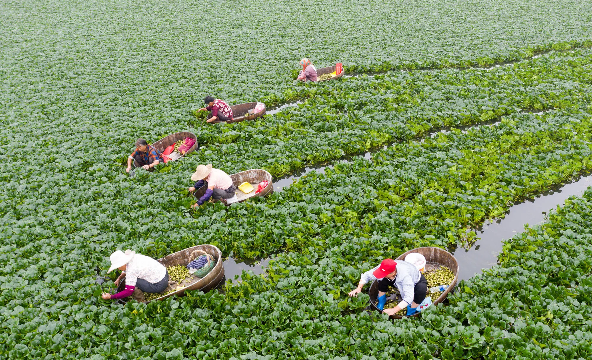 Villagers pick water chestnut, Hai'an City, Jiangsu Province, China, July 22, 2020. (Photo by Costfoto/Barcroft Media via Getty Images)