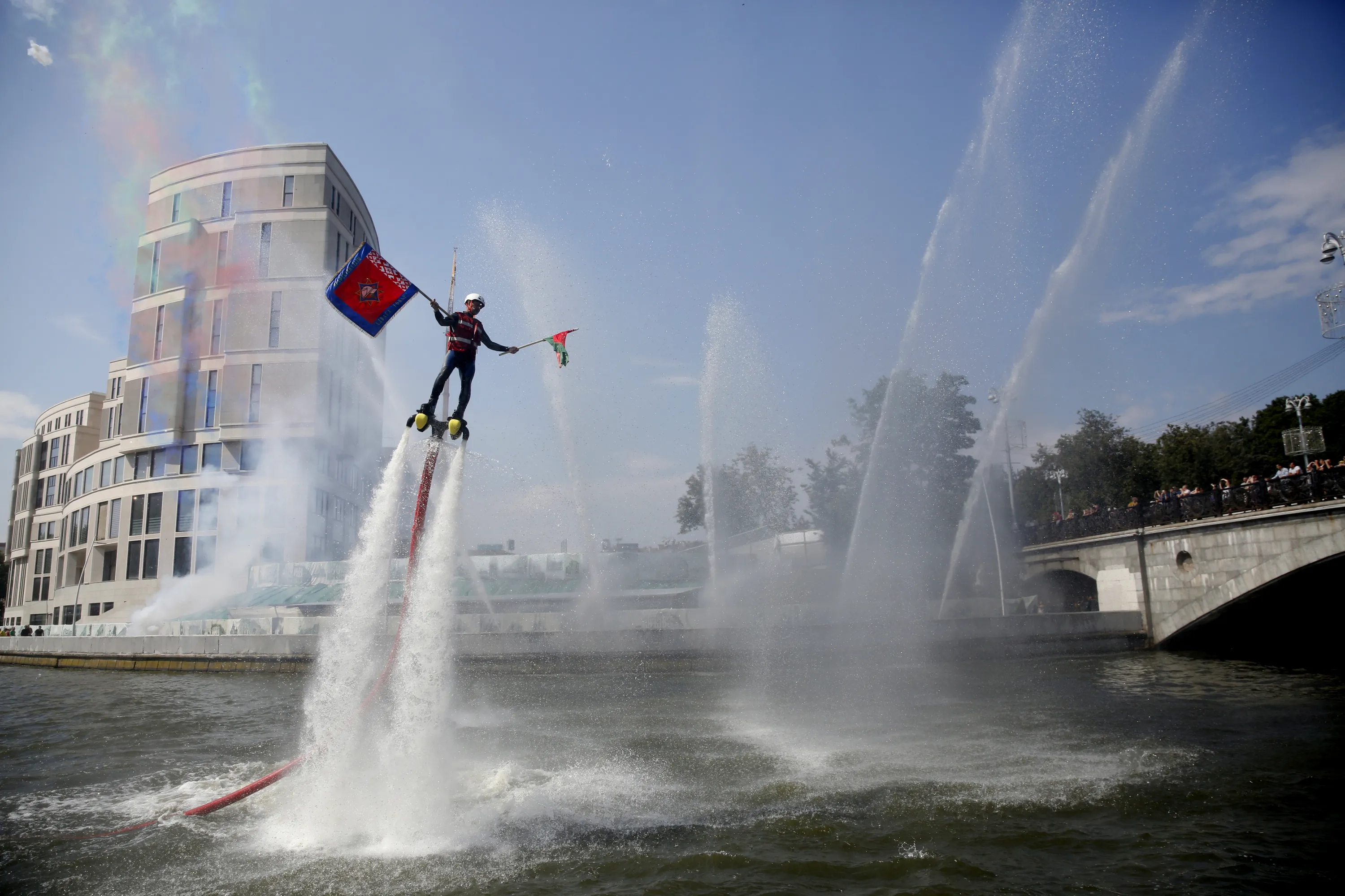 A Belarussian serviceman of the Ministry of Emergency Situations performs during a Fire Service Day celebrations, in Minsk, Belarus, 25 July 2020. Fire Service Day is a professional holiday of all firefighters of Belarus. This holiday is annually observed on 25 July, commemorating the day, when the statement for maintaining the fire department in the Minsk Governorate was adopted in 1863. (Photo by Tatyana Zenkovich/EPA/EFE)
