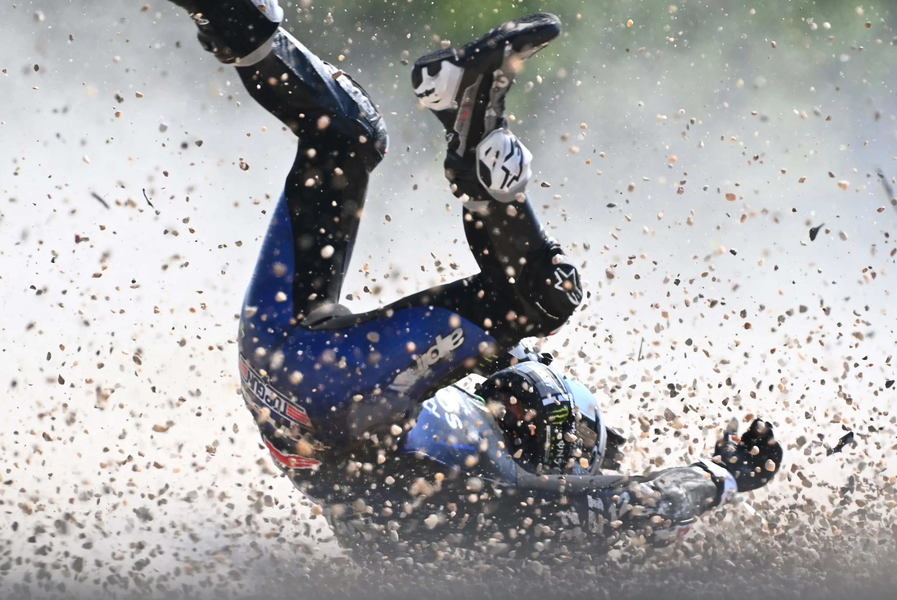 Monster Energy Yamaha's Spanish rider Maverick Vinales rolls on the ground after he crashed during the first training session ahead of the Moto GP Czech Grand Prix at Masaryk's circuit in Brno on August 7, 2020. (Photo by Joe Klamar/AFP Photo)