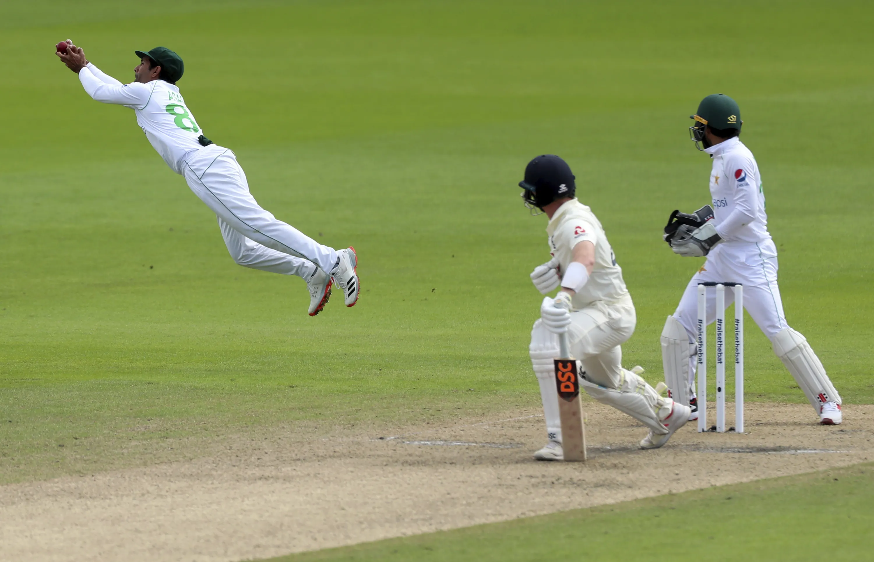Pakistan's Asad Shafiq, left, dives to catch the ball to dismiss England's Dominic Bess, center, during the third day of the first cricket Test match between England and Pakistan at Old Trafford in Manchester, England, Friday, August 7, 2020. (Photo by Lee Smith/Pool via AP Photo)