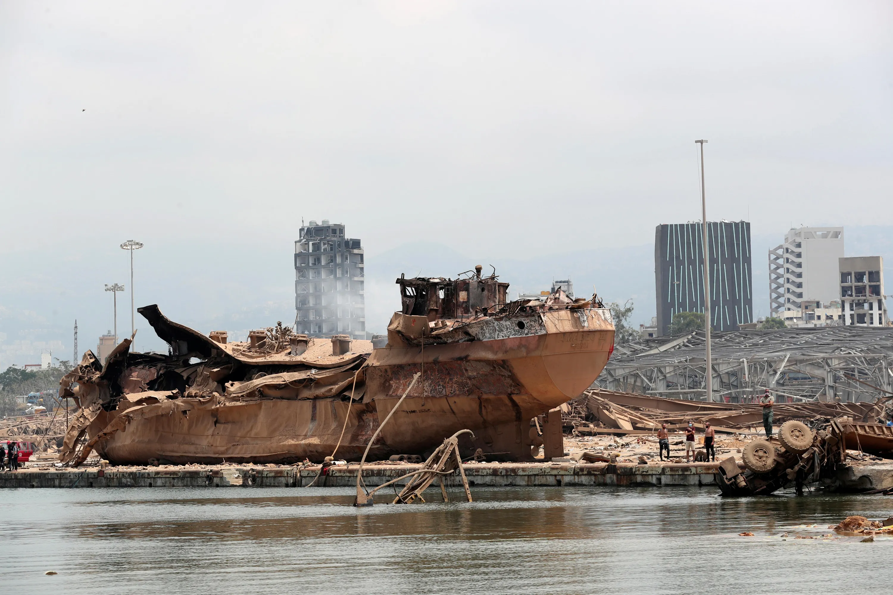 People stand next to a wreckage of a ship at the devastated site of the explosion at the port of Beirut, Lebanon on August 6, 2020. (Photo by Thibault Camus/Pool via Reuters)