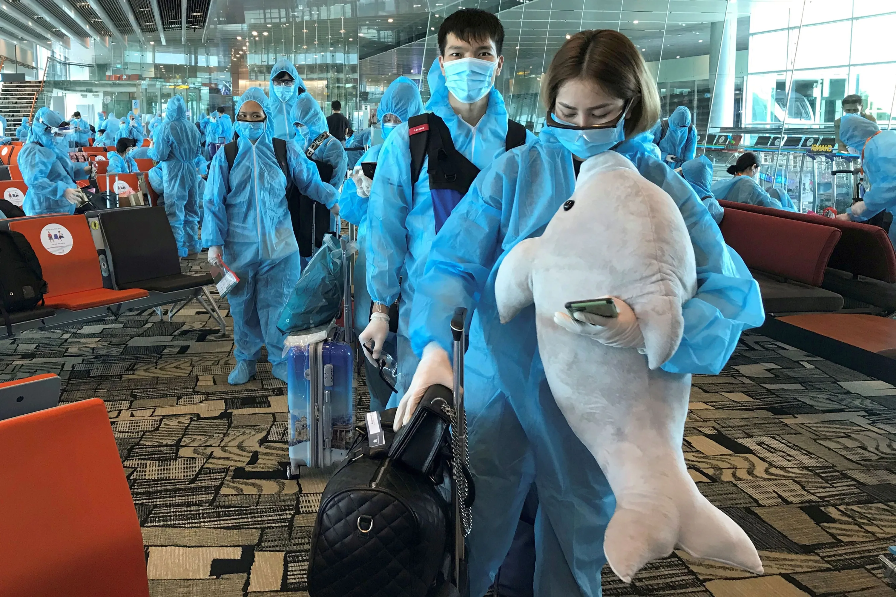 A Vietnamese woman carries a stuffed animal while boarding a repatriation flight from Singapore to Vietnam amid spread of the coronavirus disease (COVID-19) outbreak at Changi airport, Singapore on August 7, 2020. (Photo by Mai Nguyen/Reuters)
