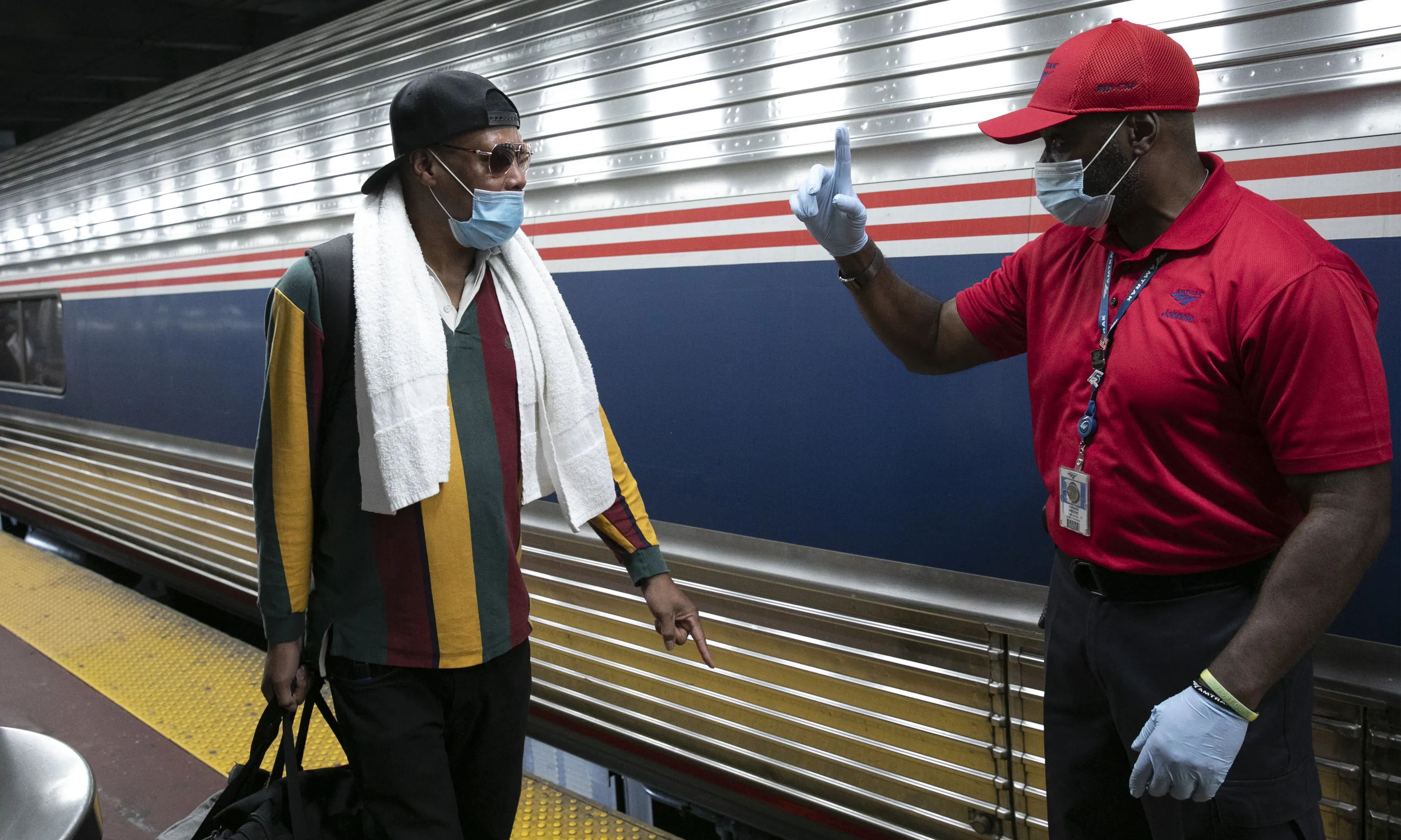 A traveler arriving on a train that originated in Miami gets directions from a porter, right, at Amtrak's Penn Station, Thursday, August 6, 2020, in New York. Mayor Bill de Blasio is asking travelers from 34 states, including Florida where COVID-19 infection rates are high, to quarantine for 14 days after arriving in the city. (Photo by Mark Lennihan/AP Photo)
