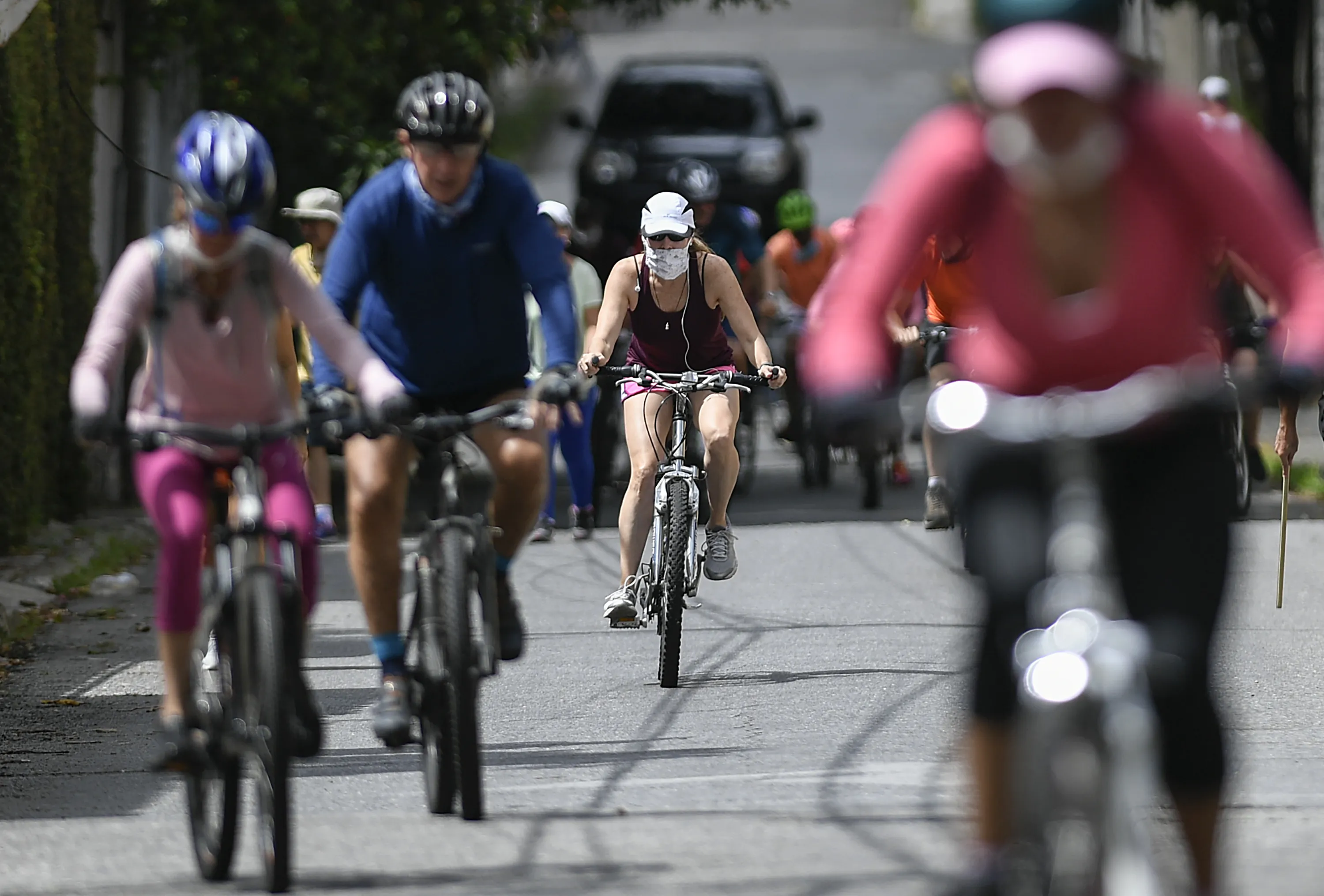 People ride their bikes amid the new coronavirus pandemic, in the Los Chorros neighborhood of Caracas, Venezuela, Sunday, July 12, 2020. (Photo by Matias Delacroix/AP Photo)