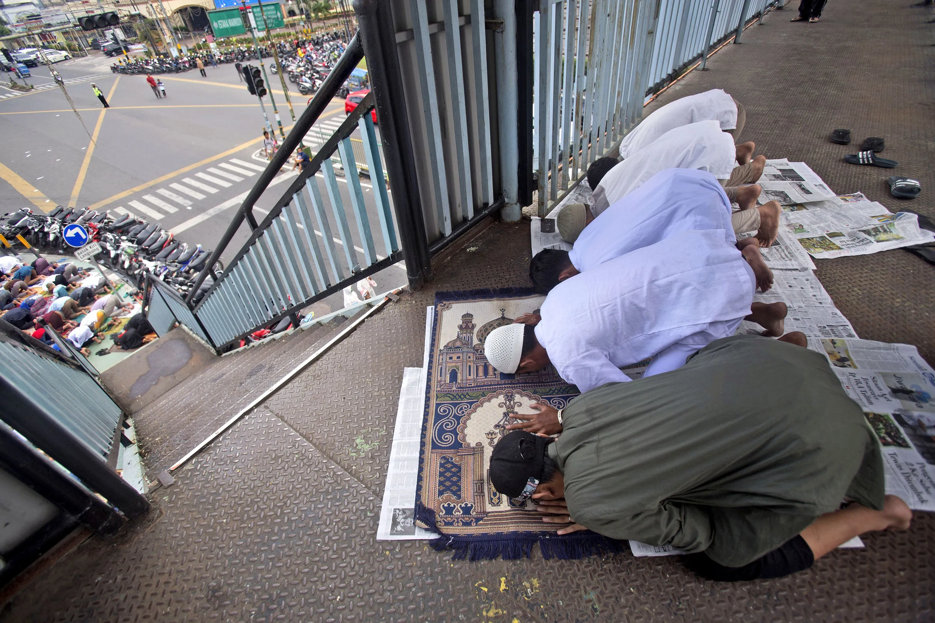Muslim youths pray on a pedestrian bridge outside a crowded mosque during an Eid al-Adha prayer in Medan, North Sumatra, Indonesia, Friday, July 31, 2020. Eid al-Adha, or “Feast of the Sacrifice”, is a holiday which honors the prophet Ibrahim, or Abraham, as he is known in the Bible, for his willingness to sacrifice his son on the order of God who was testing his faith. (Photo by Binsar Bakkara/AP Photo)