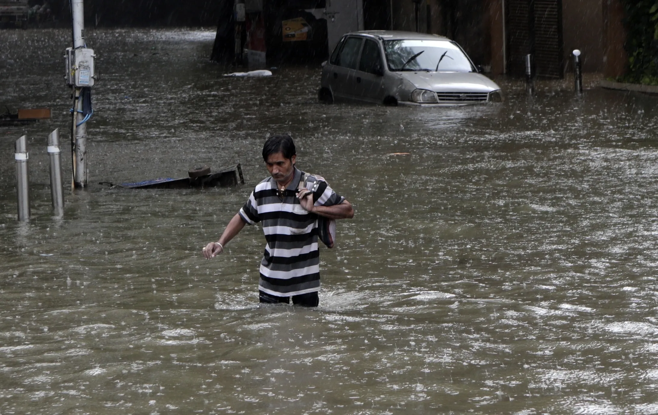 A man wades through a water logged street during heavy rain in Mumbai, India, Tuesday, August 4, 2020. India's monsoon season runs from June to September. (Photo by Rajanish Kakade/AP Photo)