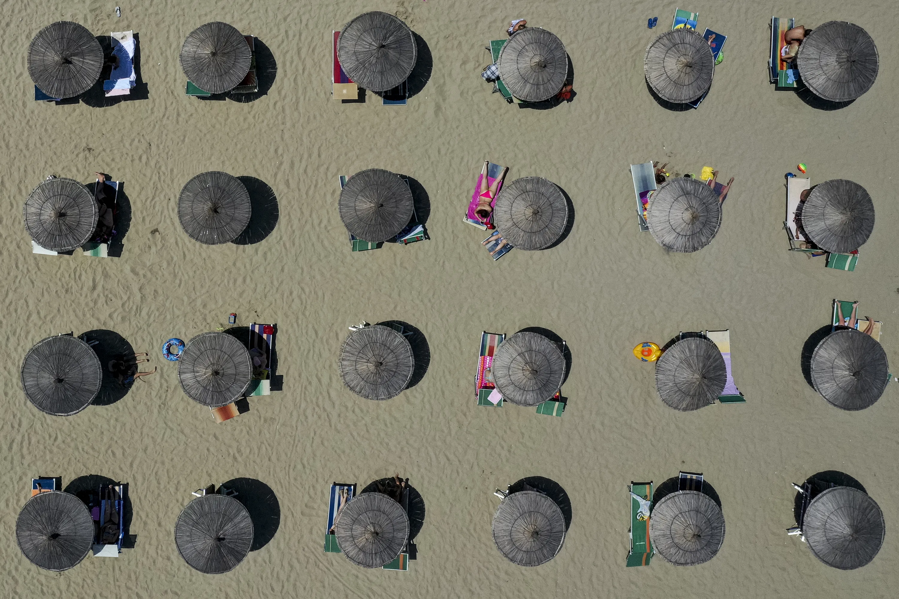 This aerial view taken on July 6, 2019, shows parasols on a beach of the Adriatic Sea in Durres, as a heatwave sweeps through Europe. Temperatures rise to 39 degrees Celsius in Albania. (Photo by Gent Shkullaku/AFP Photo)