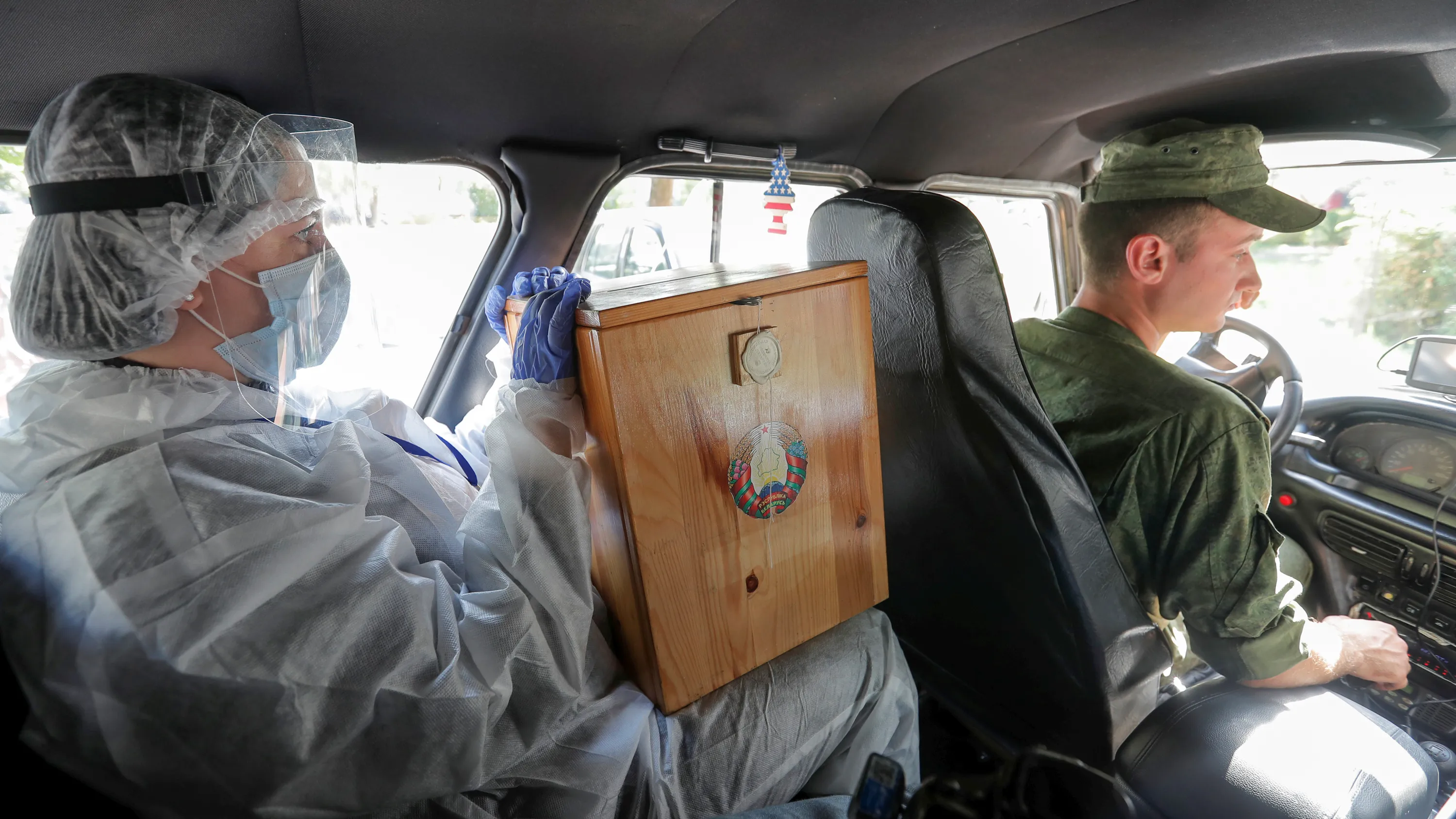A member of an electoral commission holding a mobile ballot box and wearing protective gear sits inside a car while visiting local residents during the presidential election in Minsk, Belarus on August 9, 2020. (Photo by Vasily Fedosenko/Reuters)