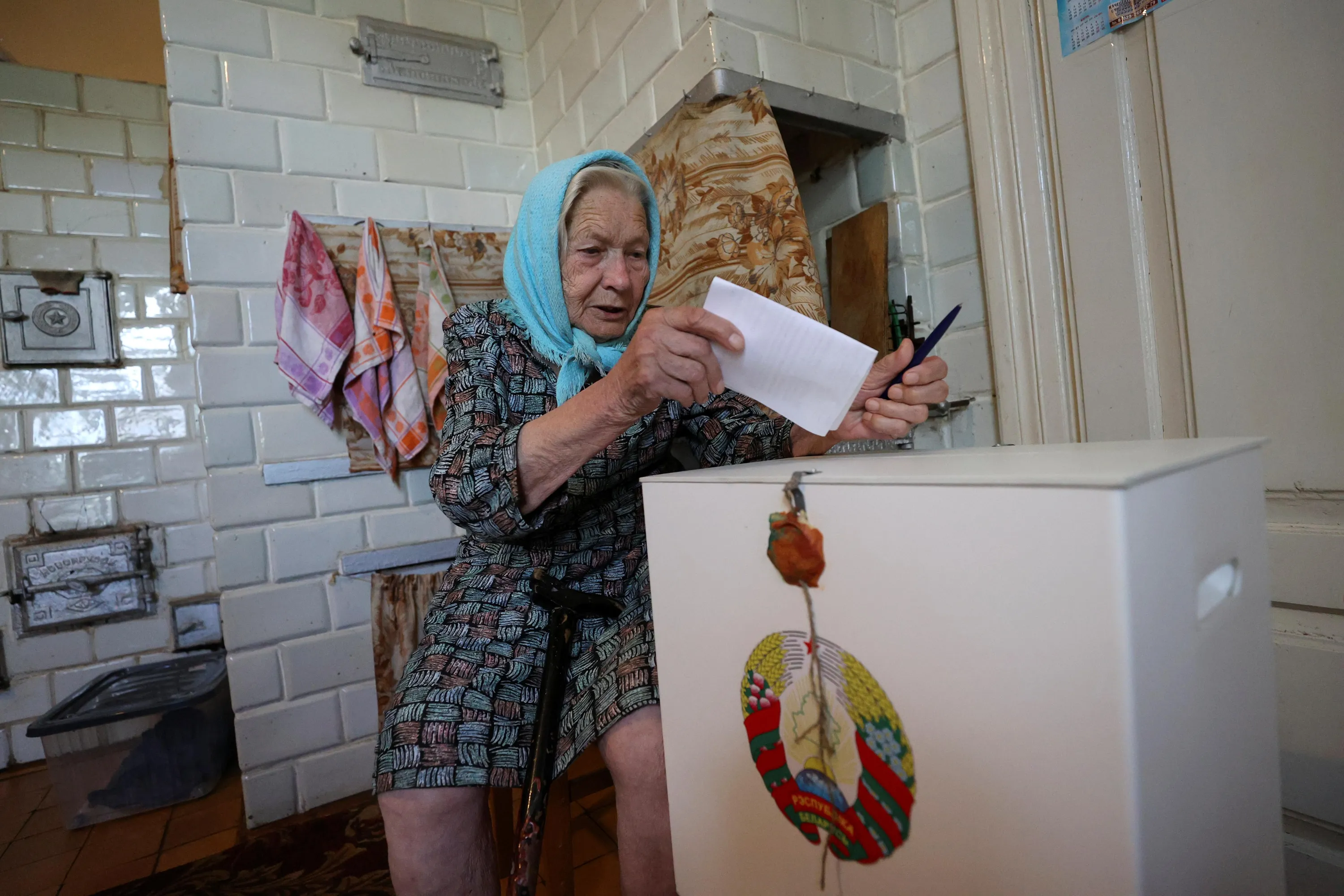 An elderly woman casts her vote into a mobile ballot box in a house as members of an electoral commission visit local residents during the presidential election in the settlement of Nizhniye Pogorany near Grodno, Belarus on August 9, 2020. (Photo by Reuters/Stringer)