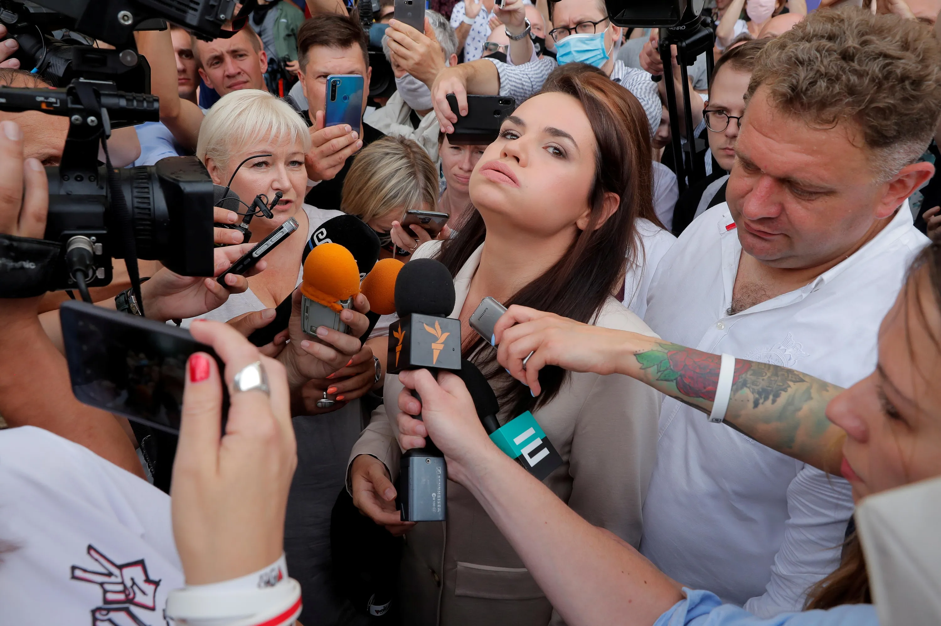 Belarusian united opposition candidate Svetlana Tikhanouskaya reacts while speaking with journalists outside a polling station during the presidential election in Minsk, Belarus on August 9, 2020. (Photo by Vasily Fedosenko/Reuters)