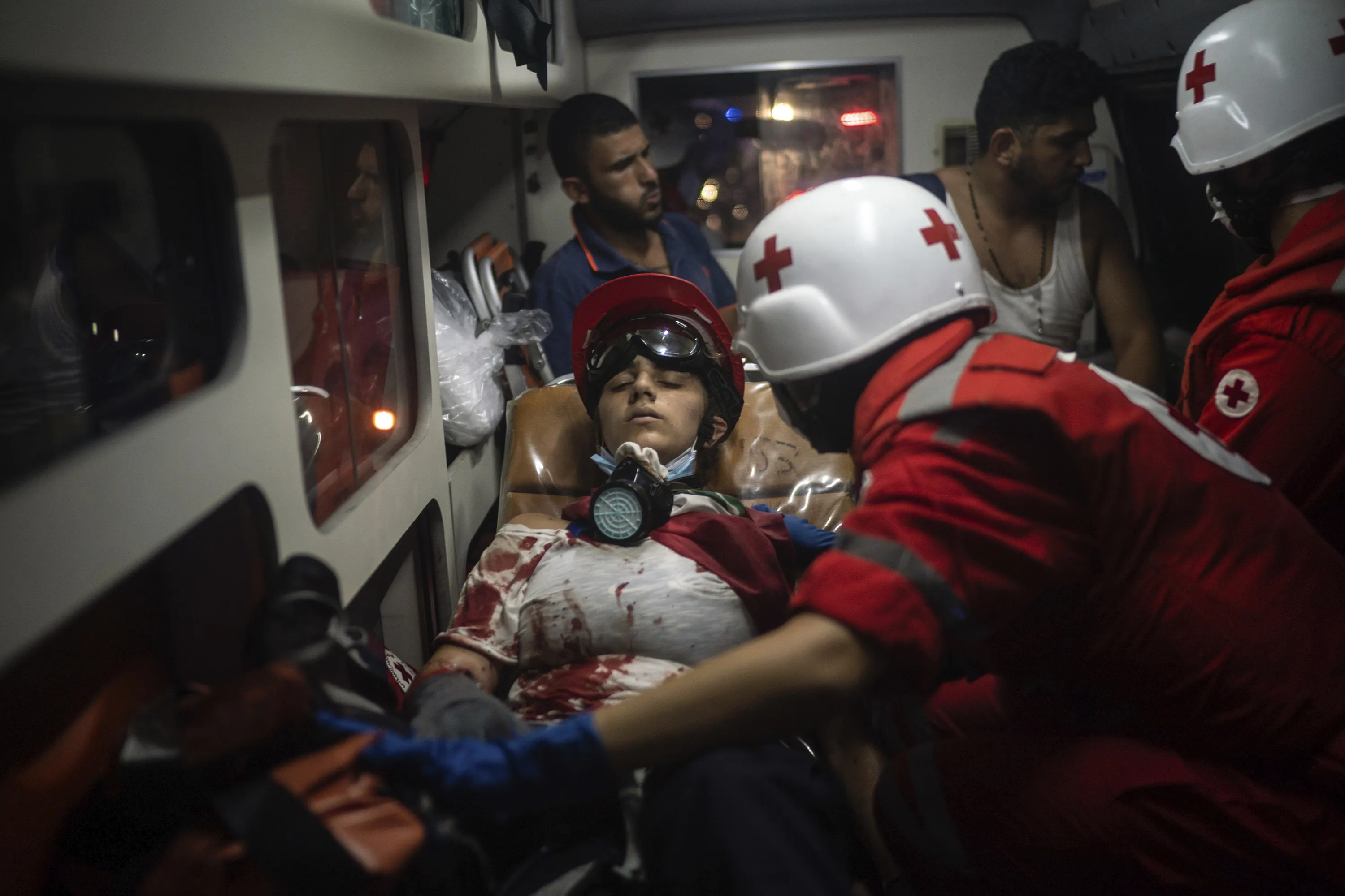 An injured demonstrator is taken by an ambulance after clashes with police during an anti-government protest, following last week's massive explosion which devastated Beirut, Lebanon, Tuesday, August 11, 2020. (Photo by Felipe Dana/AP Photo)
