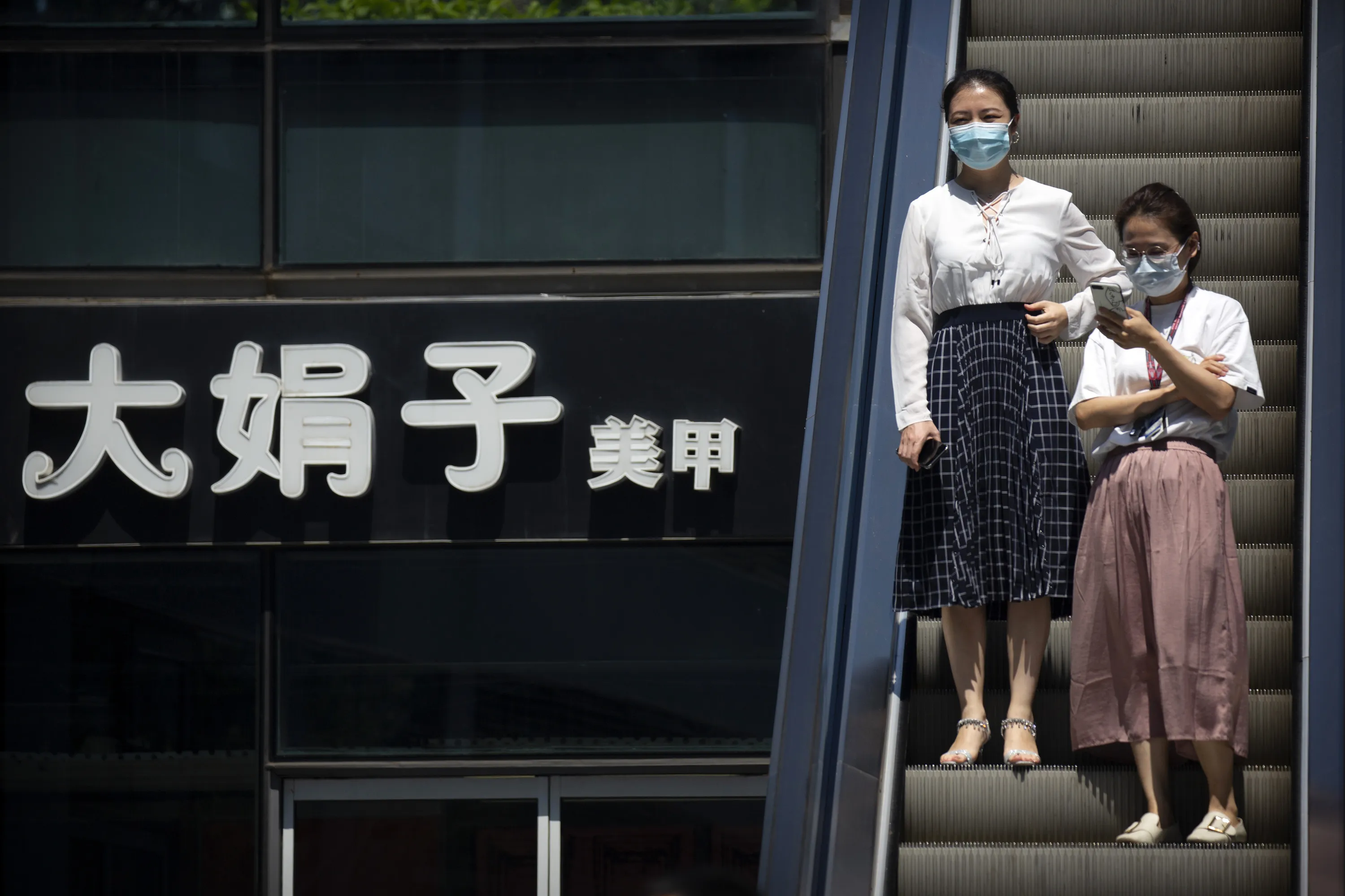 People wearing face masks to protect against the coronavirus ride an escalator past a sign of a nail salon at a shopping and office complex in Beijing, Tuesday, August 11, 2020. Mainland China and semi-autonomous Hong Kong saw declines in their recent outbreaks Tuesday. (Photo by Mark Schiefelbein/AP Photo)