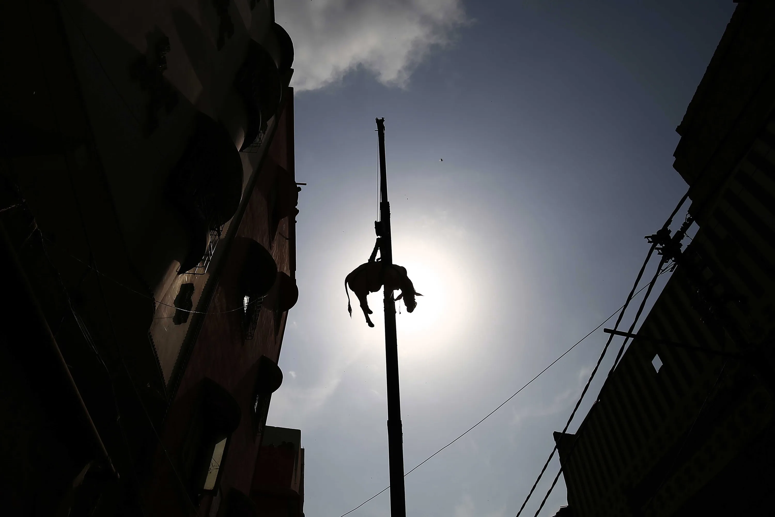 People use a crane to load sacrificial animals to their roof top, ahead of the Eid al-Adha festival in Karachi, Pakistan, 26 July 2020. Eid al-Adha is the holiest of the two Muslims holidays celebrated each year, it marks the yearly Muslim pilgrimage (Hajj) to visit Mecca, the holiest place in Islam. Muslims slaughter a sacrificial animal and split the meat into three parts, one for the family, one for friends and relatives, and one for the poor and needy. (Photo by Shahzaib Akber/EPA/EFE)