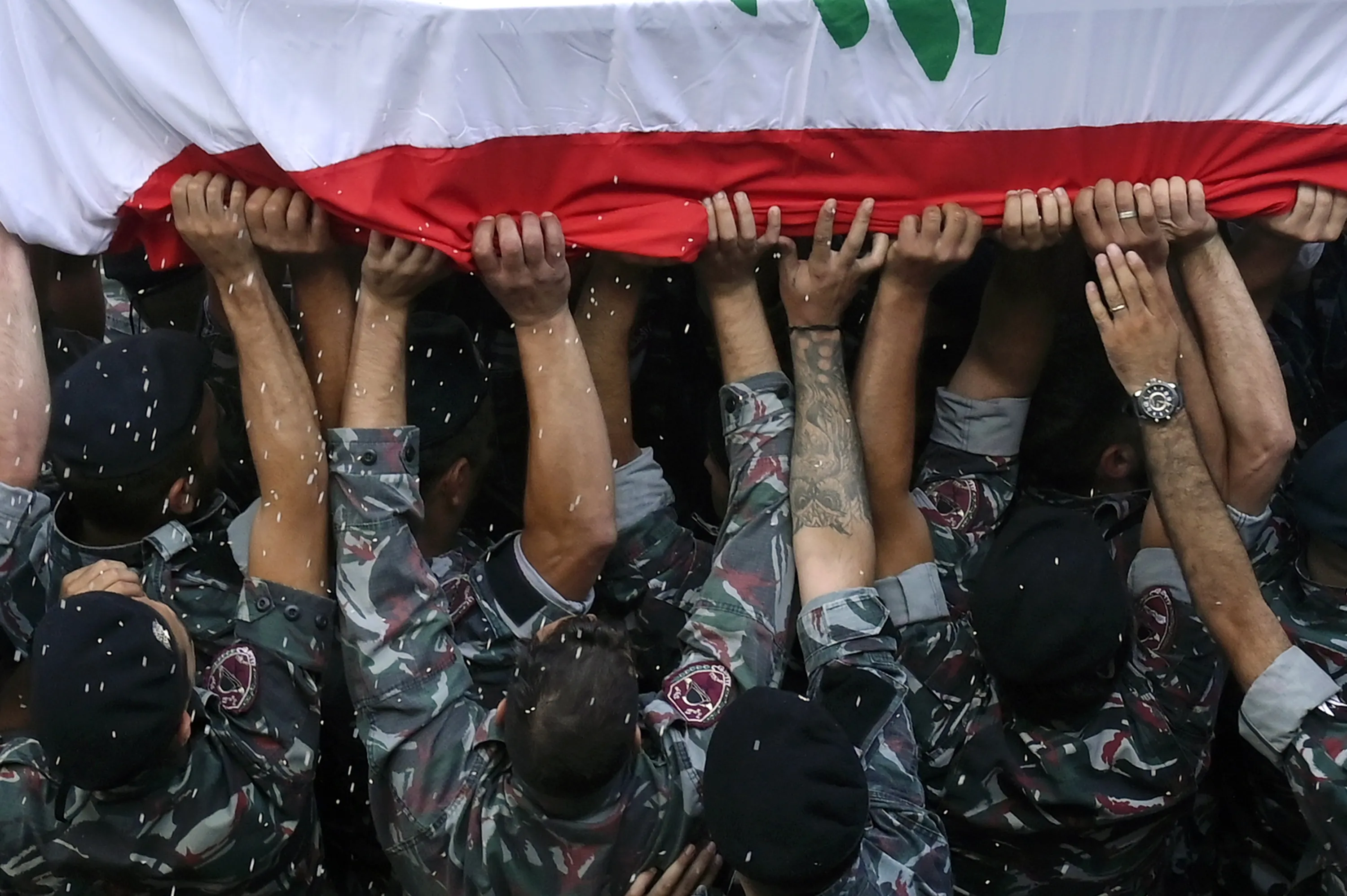 Firefighters carry the coffin of their friend Joe Noun, one of ten firefighters who were killed during the explosion that hit the Beirut port, during his funeral at the firefighter headquarters, in Karantina Beirut, Lebanon, 12 Auguat 2020. Lebanese Health Ministry said at least 171 people were killed, and more than 6000 injured in the Beirut blast that devastated the port area on 04 August and believed to have been caused by an estimated 2,750 tons of ammonium nitrate stored in a warehouse. (Photo by Wael Hamzeh/EPA/EFE)