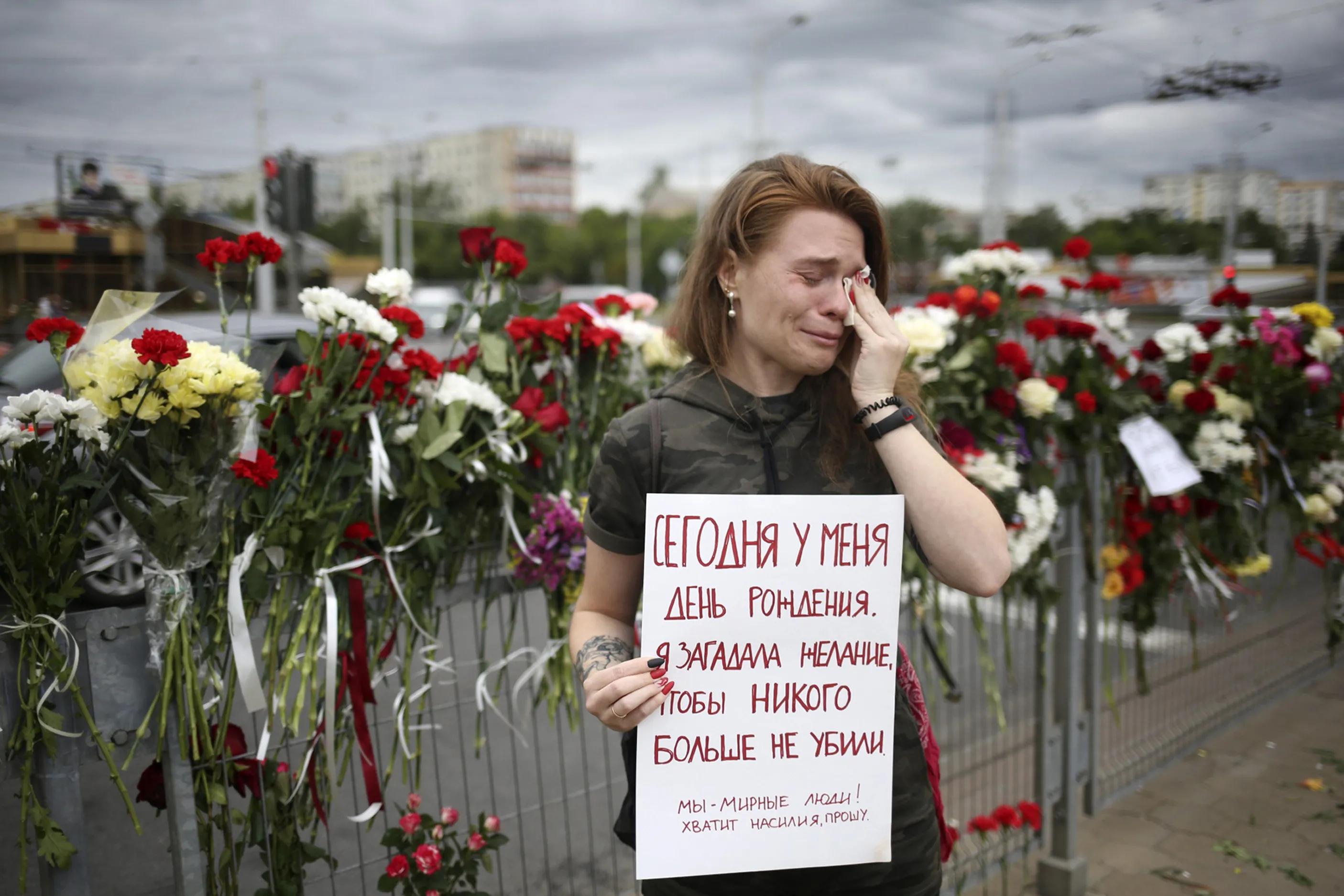 Alina Krus, 26, holds a poster at the place where a protester died amid the clashes in Minsk, Belarus, Wednesday, August 12, 2020 saying “It's my birthday today. I made a wish that no one gets killed. We are peaceful people. Enough with the violence, please”. Krus says it is her first time protesting in the street – she couldn't stay home and celebrate her birthday while so many people she knows got detained. (Photo by AP Photo/Stringer)