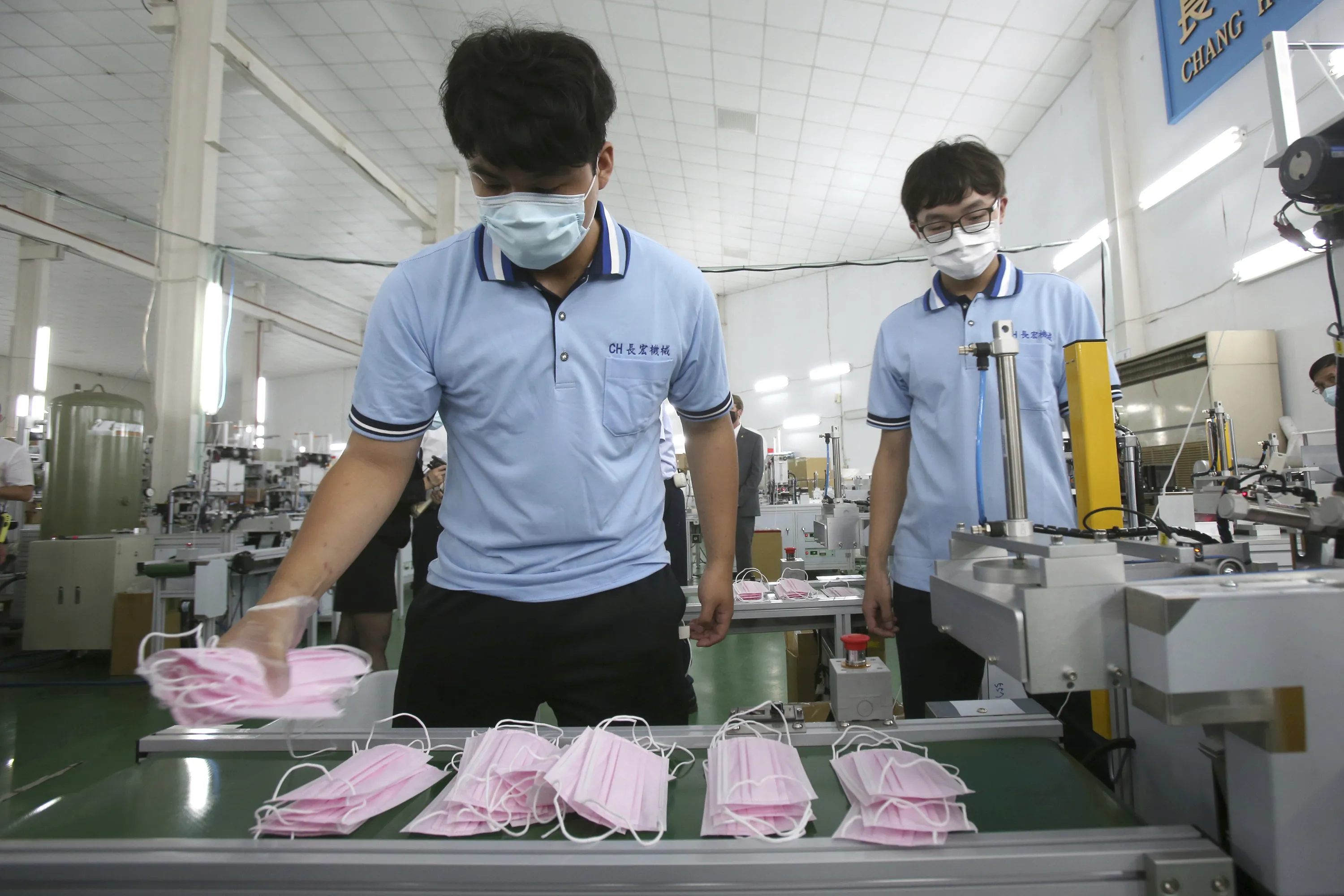 Workers arrange face masks to protect against the coronavirus at a mask factory where U.S. Health and Human Services Secretary Alex Azar visited during an inspection tour in New Taipei City, Taiwan, Wednesday, August 12, 2020. (Photo by Chiang Ying-ying/AP Photo)