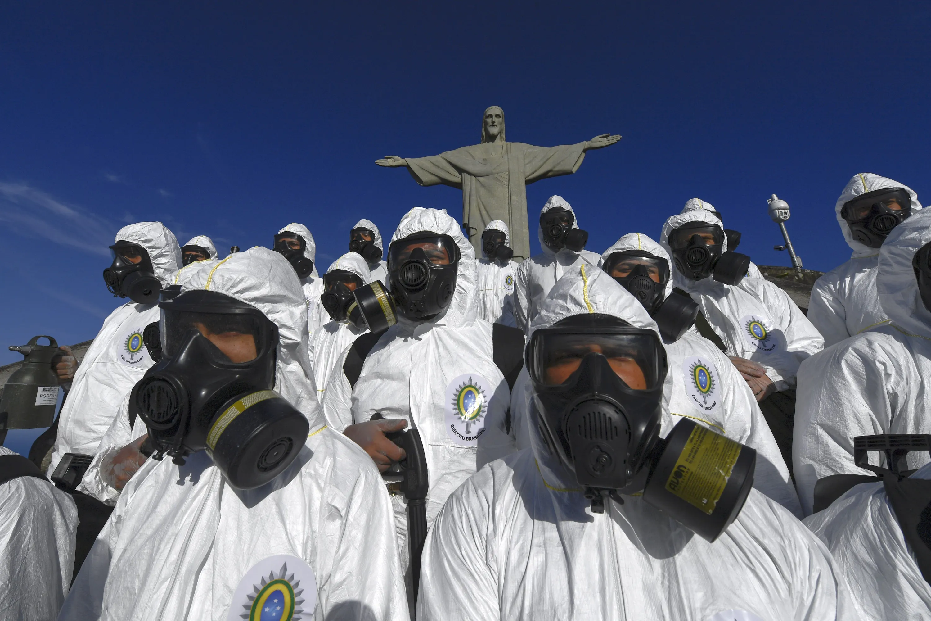 Soldiers of the Brazilian Armed Forces are seen during the disinfection procedures of the Christ The Redeemer statue at the Corcovado mountain prior to the opening of the touristic attraction on August 15, in Rio de Janeiro, Brazil, on August 13, 2020, amid the COVID-19 novel coronavirus pandemic. (Photo by Mauro Pimentel/AFP Photo)