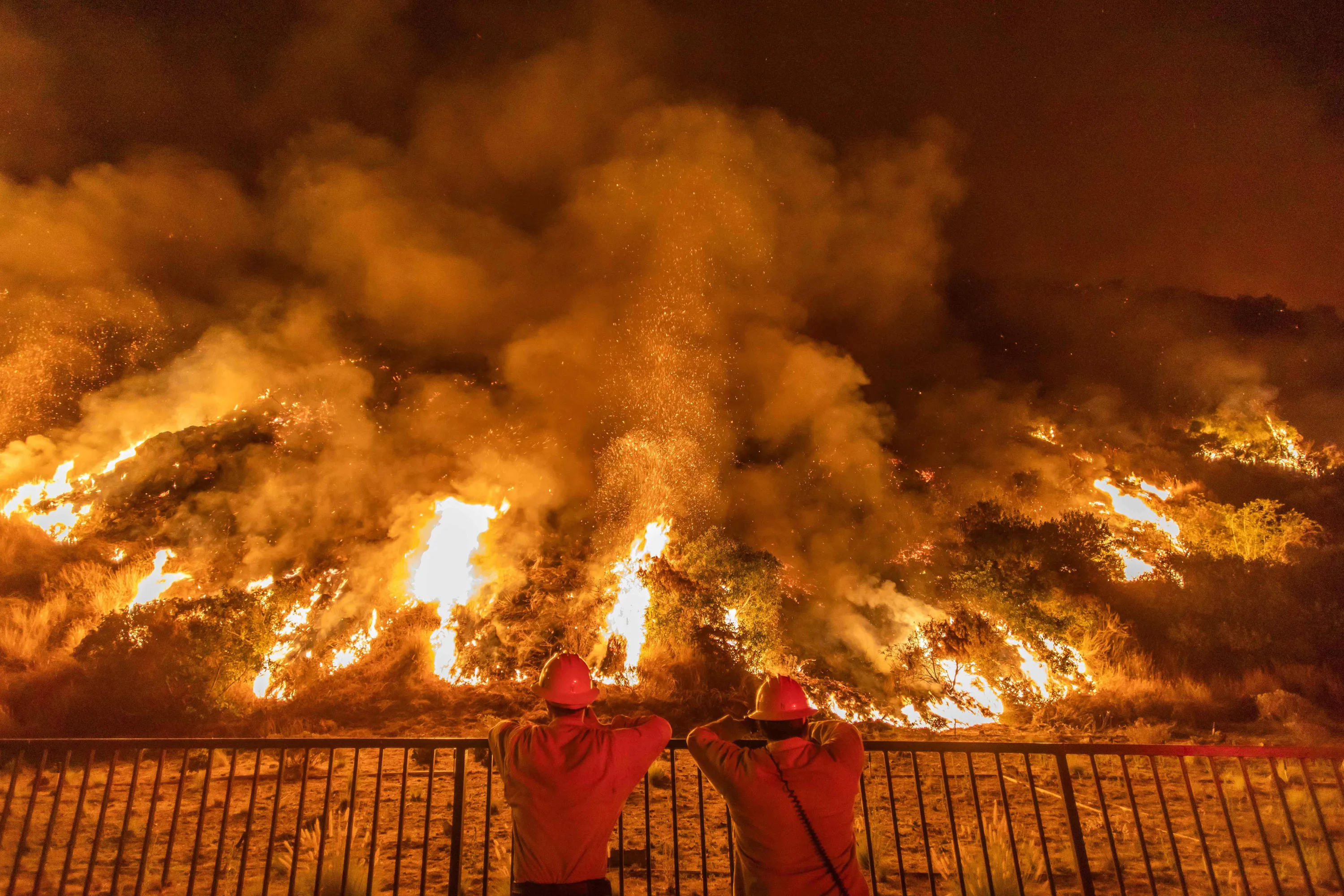 Firefighters look at smoke and flames rising from the Ranch fire in the San Gabriel mountains above Azusa, 25 miles east of Los Angeles, California, on August 14, 2020. The Los Angeles County Fire Department was alerted to the brush fire at 2:45 pm on August 13, 2020. By August 14 in the morning, the blaze was still at 0% containment. (Photo by Apu Gomes/AFP Photo)
