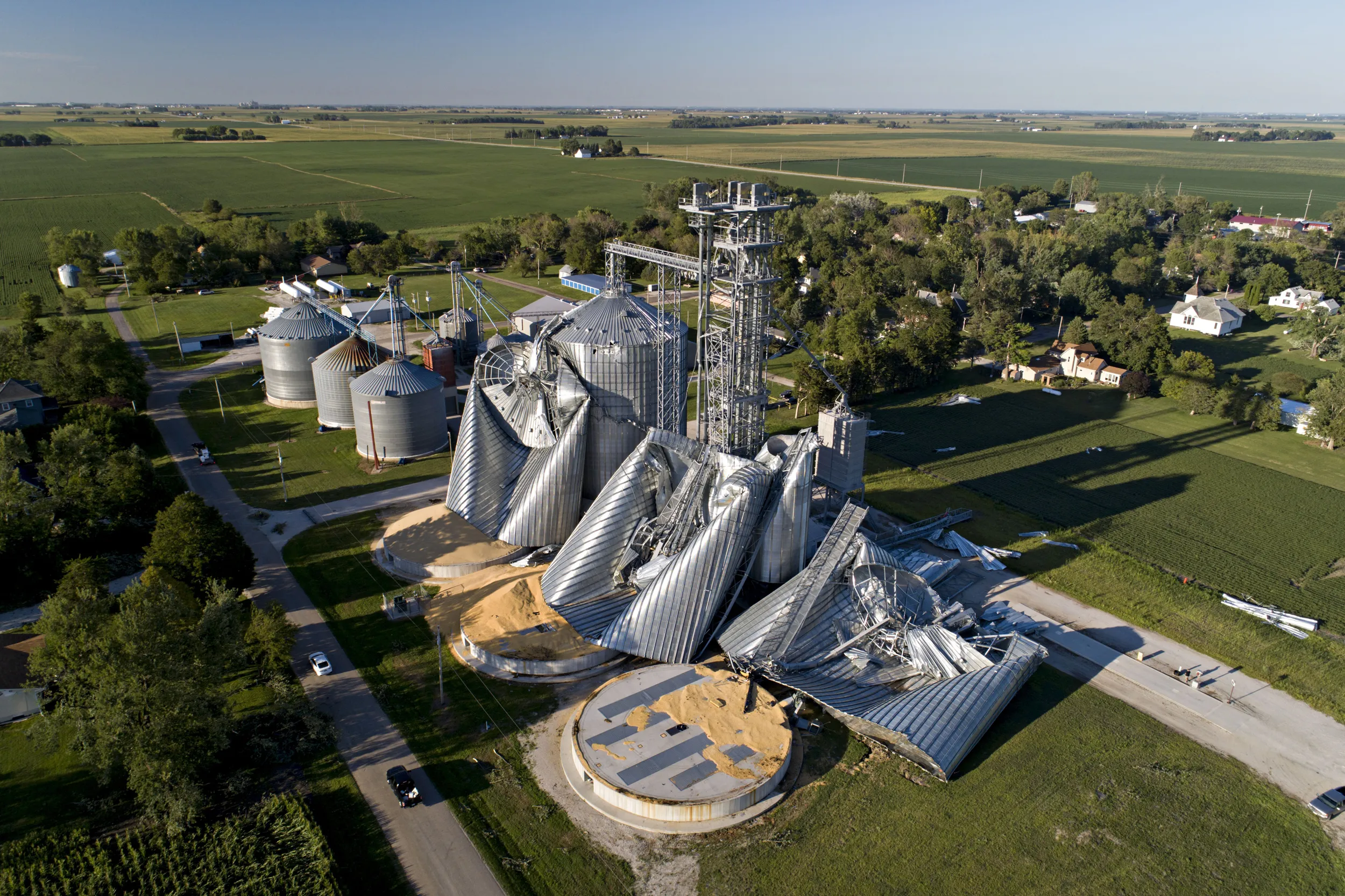 In this aerial image from a drone, damaged grain bins are shown at the Heartland Co-Op grain elevator on August 11, 2020 in Luther, Iowa. Iowa Gov. Kim Reynolds said early estimates indicate 10 million acres, nearly a 1/3 of the states land used for crops, were damaged when a powerful storm battered the region a day earlier. (Photo by Daniel Acker/Getty Images)