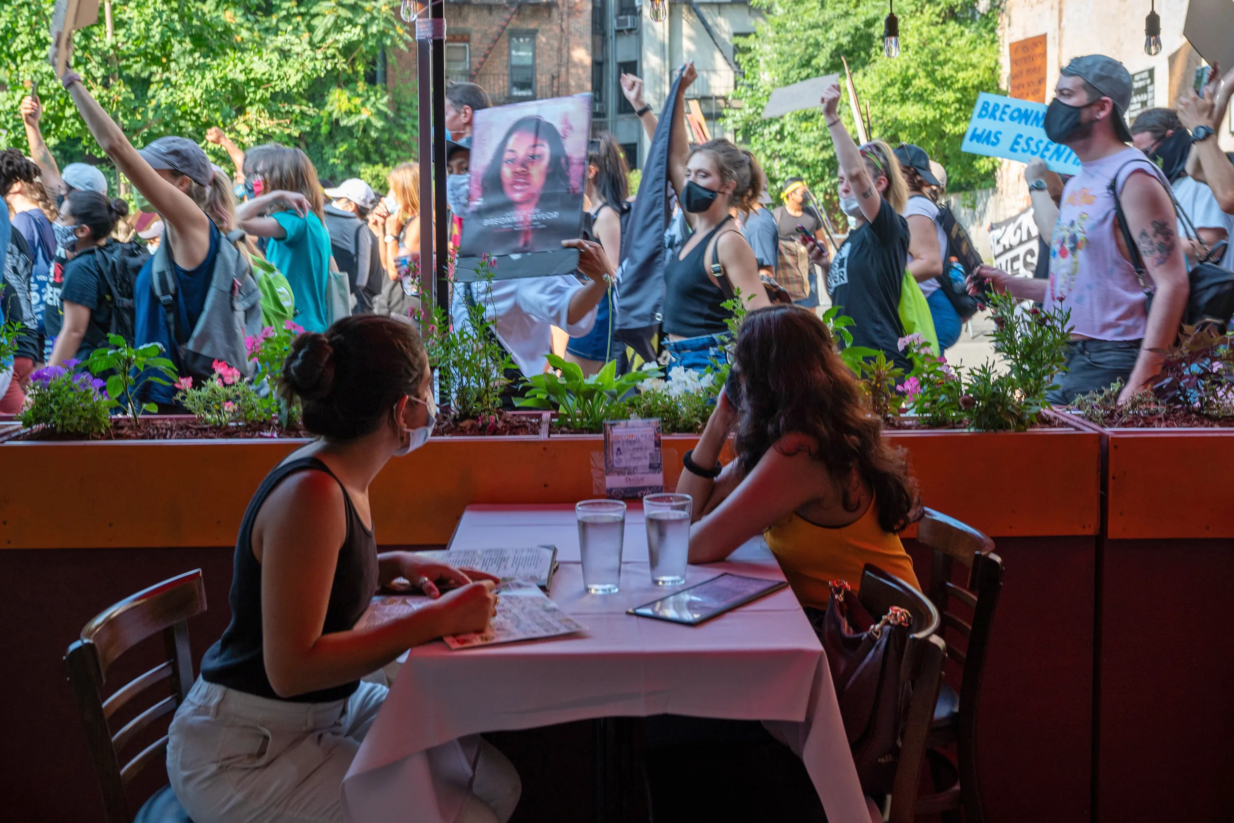 Protesters gather at Times Square to march uptown via the Henry Hudson Parkway on August 9, 2020 in New York City. Protesters took to the streets to demand the arrest of the officer responsible for the death of Breonna Taylor on March 13, 2020 in Louisville, Kentucky. (Photo by David Dee Delgado/Getty Images)