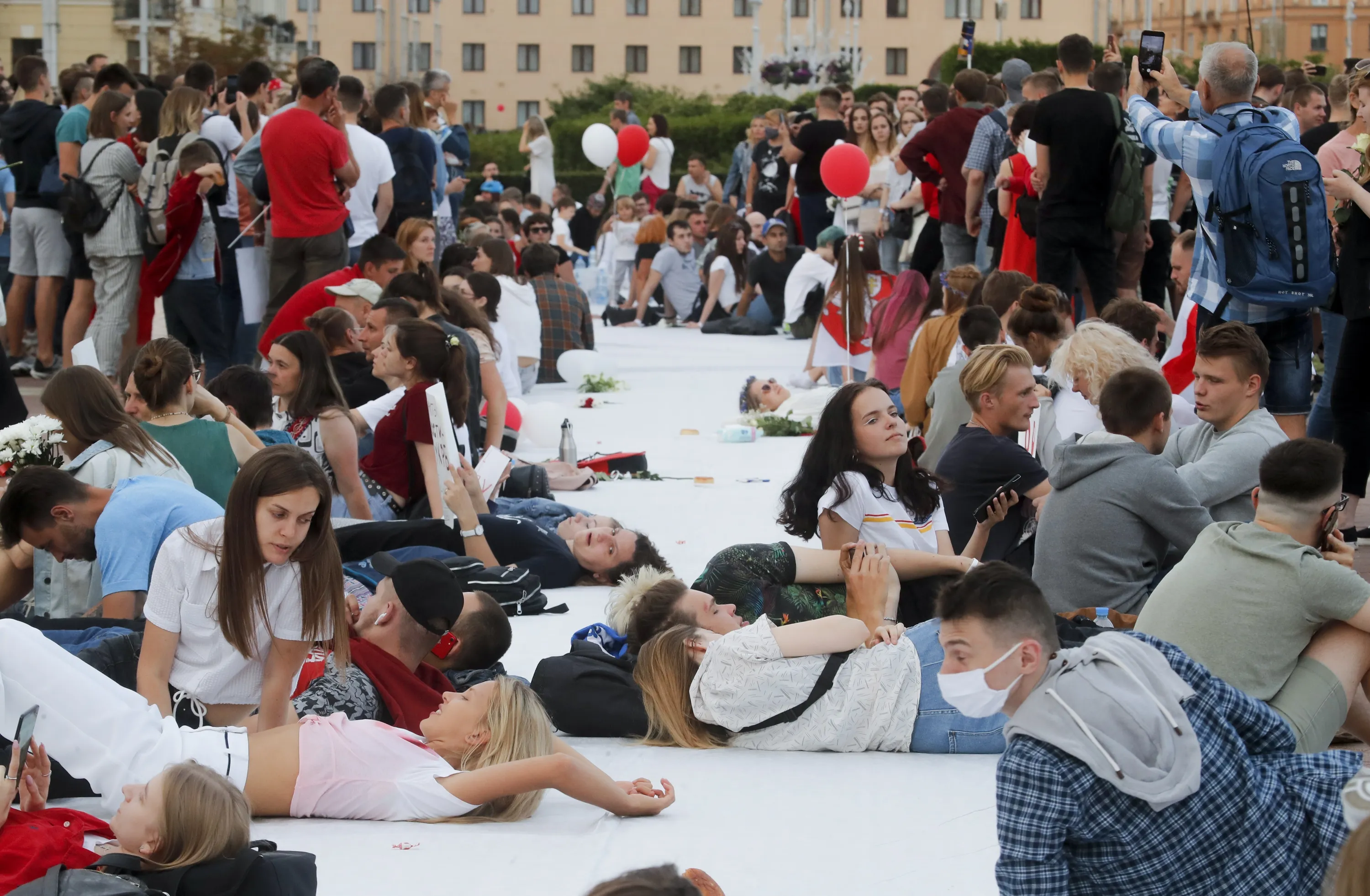 People sit on a white canvas in front of government building in Minsk, Belarus, Saturday, August 15, 2020. Tens of thousands of people have flooded the heart of the Belarus capital of Minsk in a show of anger over a brutal police crackdown this week on peaceful protesters that followed a disputed election. (Photo by Dmitri Lovetsky/AP Photo)