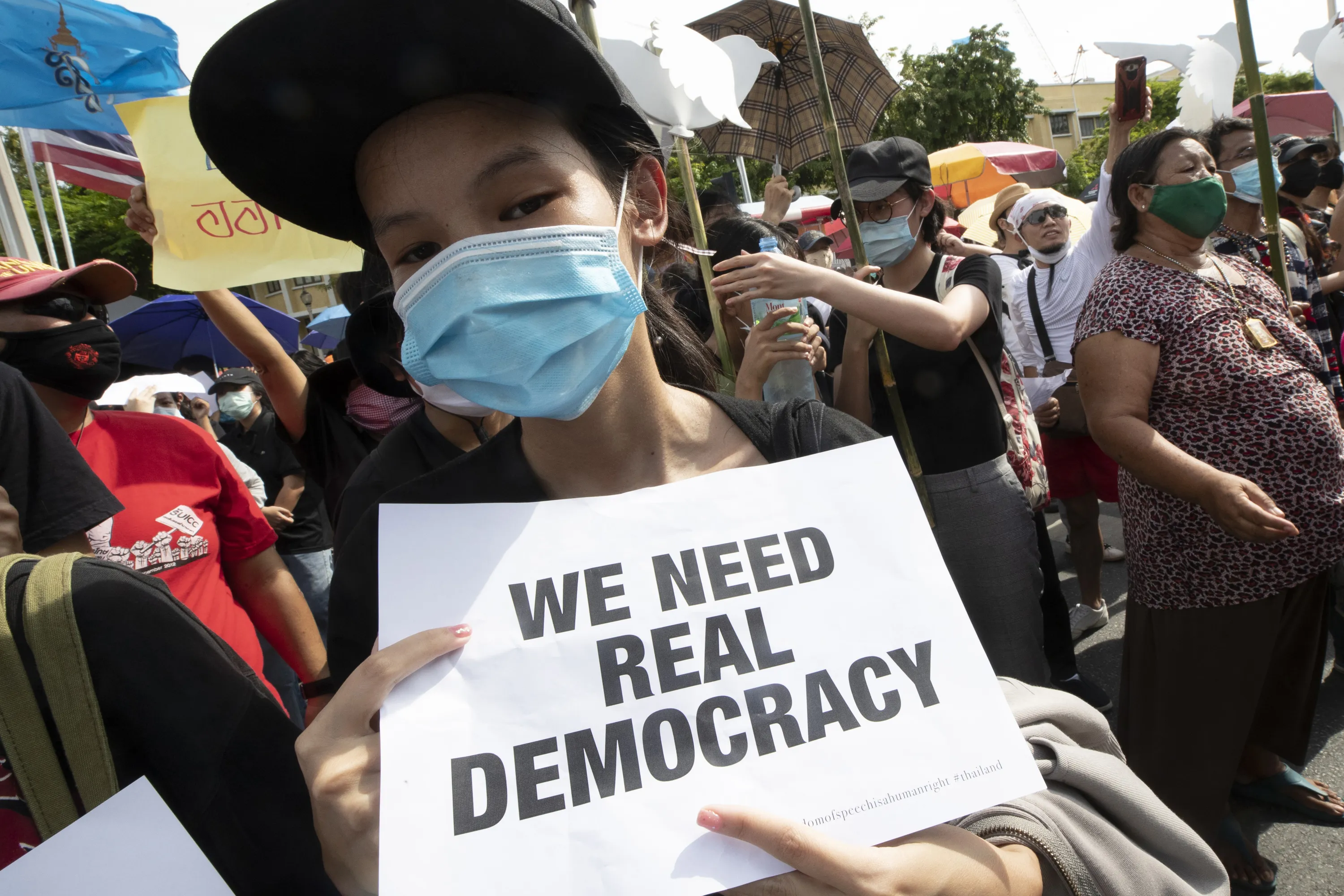 A pro-democracy student holds a poster during a rally in Bangkok, Thailand, Sunday, August 16, 2020. (Photo by Sakchai Lalit/AP Photo)