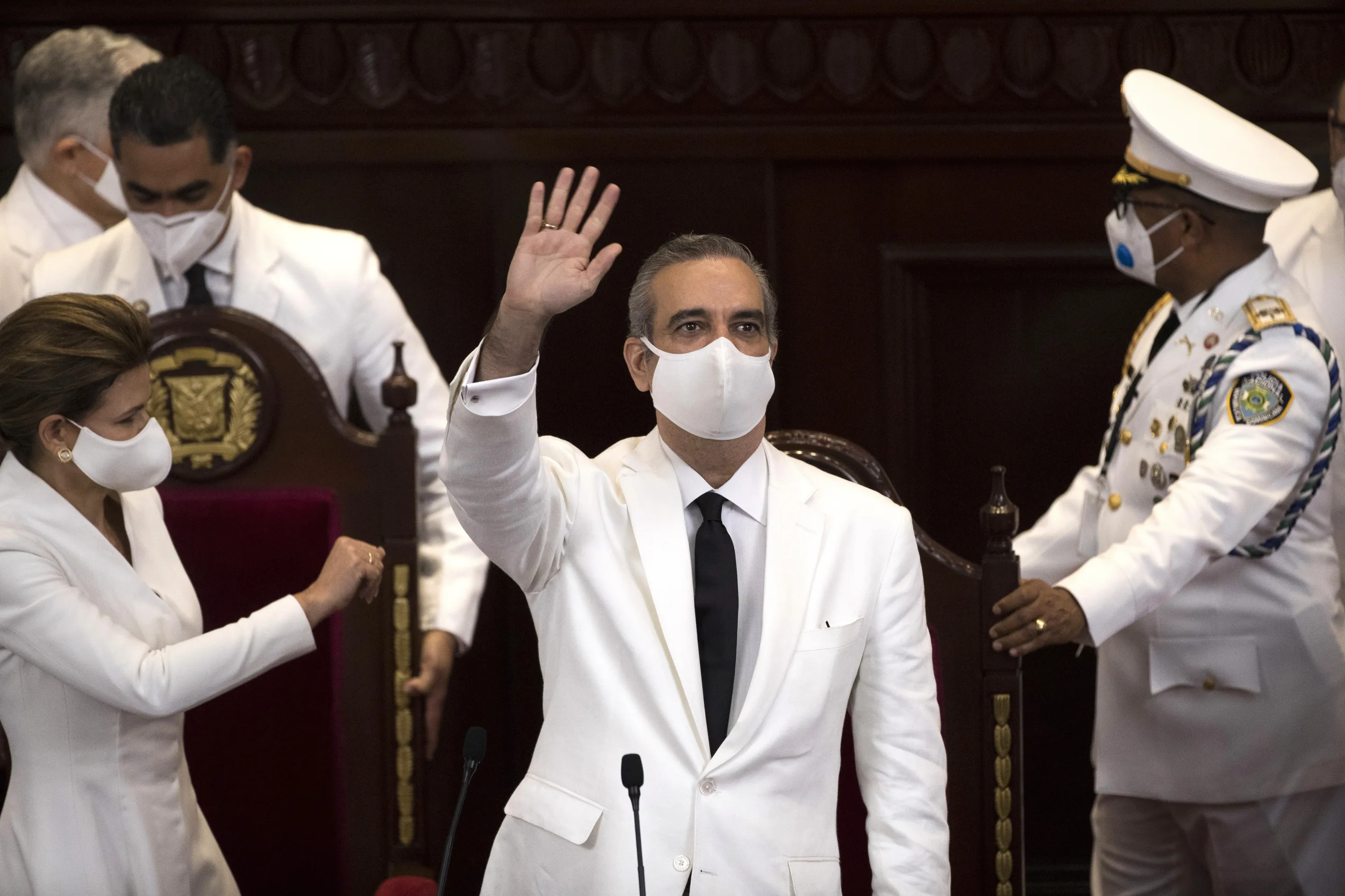 Dominican Republic's President Luis Abinader, wearing a face mask amid the new coronavirus pandemic, waves during his swearing-in ceremony in Santo Domingo, Dominican Republic, Sunday, August 16, 2020. (Photo by Orlando Barria/Pool photo via AP Photo)