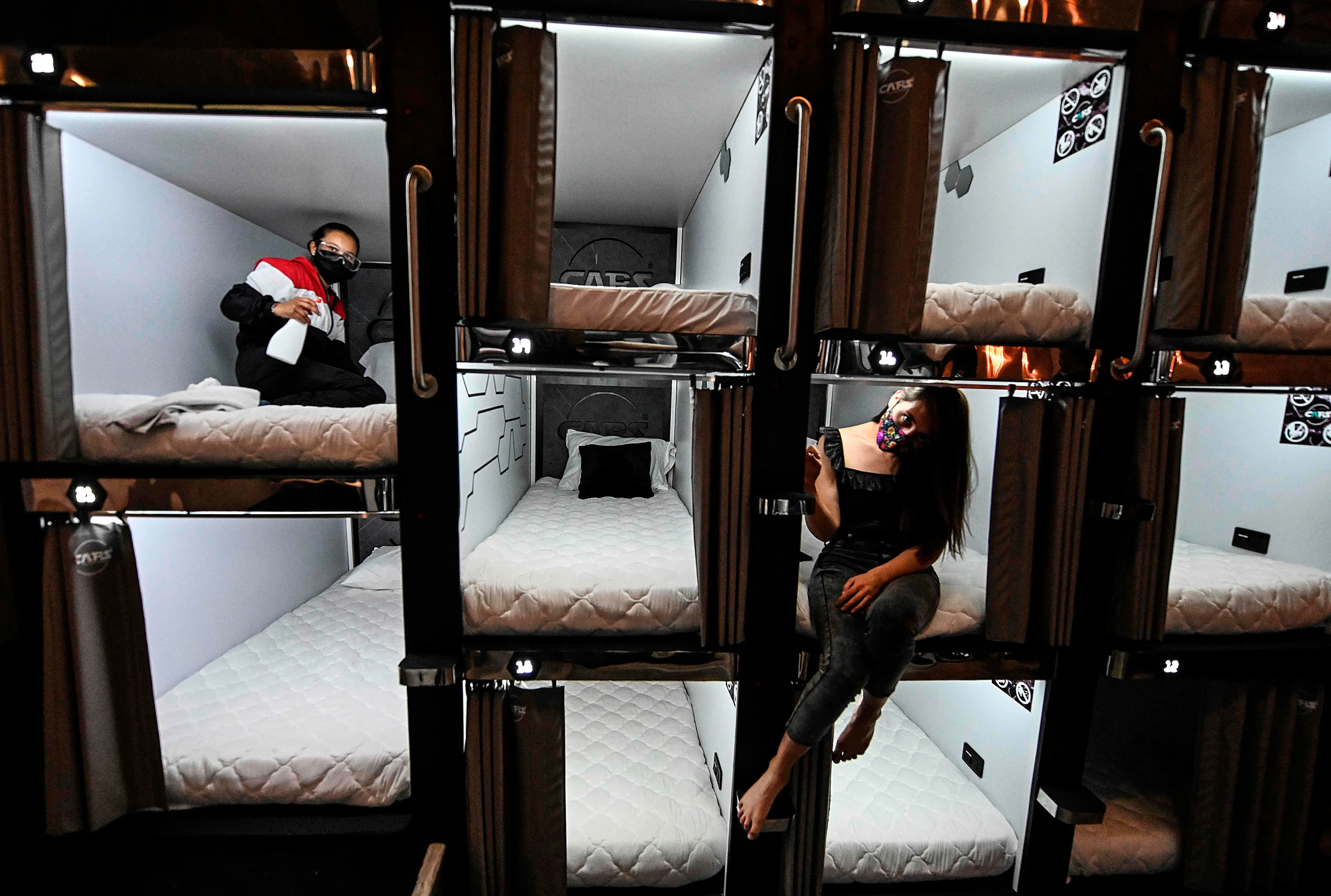 Women pose on pods at a capsule hotel in Bogota, Colombia on August 15, 2020. (Photo by Juan BarretoAFP)