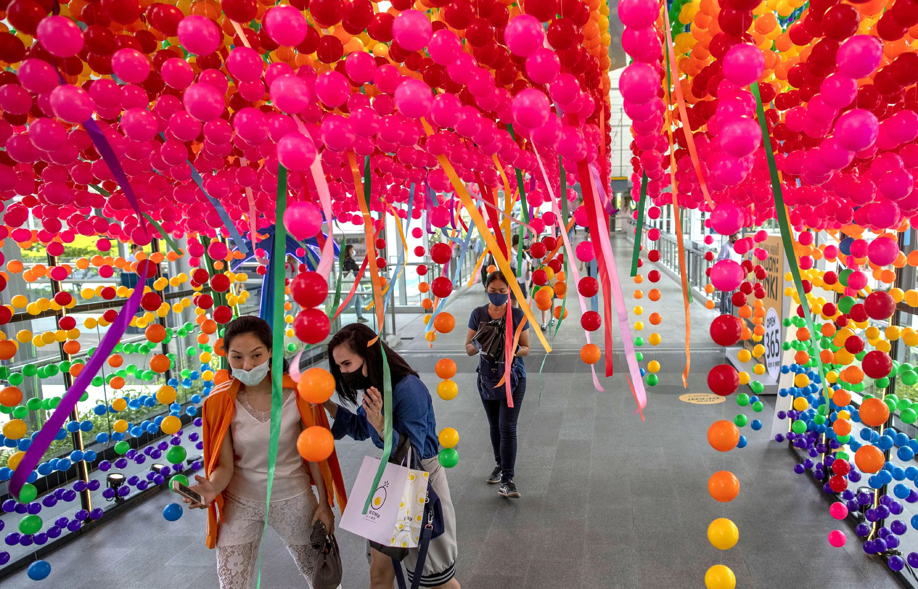 Shoppers walk through decorations at the entrance to a shopping mall promoting a sale Thursday, August 6, 2020, in Bangkok, Thailand. Thailand has managed to curb COVID-19 infections over the last three months with strict controls on entry into the country and aggressive testing and quarantine requirements. But its economy is expected to contract by at least 5% in 2020, according to the World Bank. (Photo by Gemunu Amarasinghe/AP Photo)