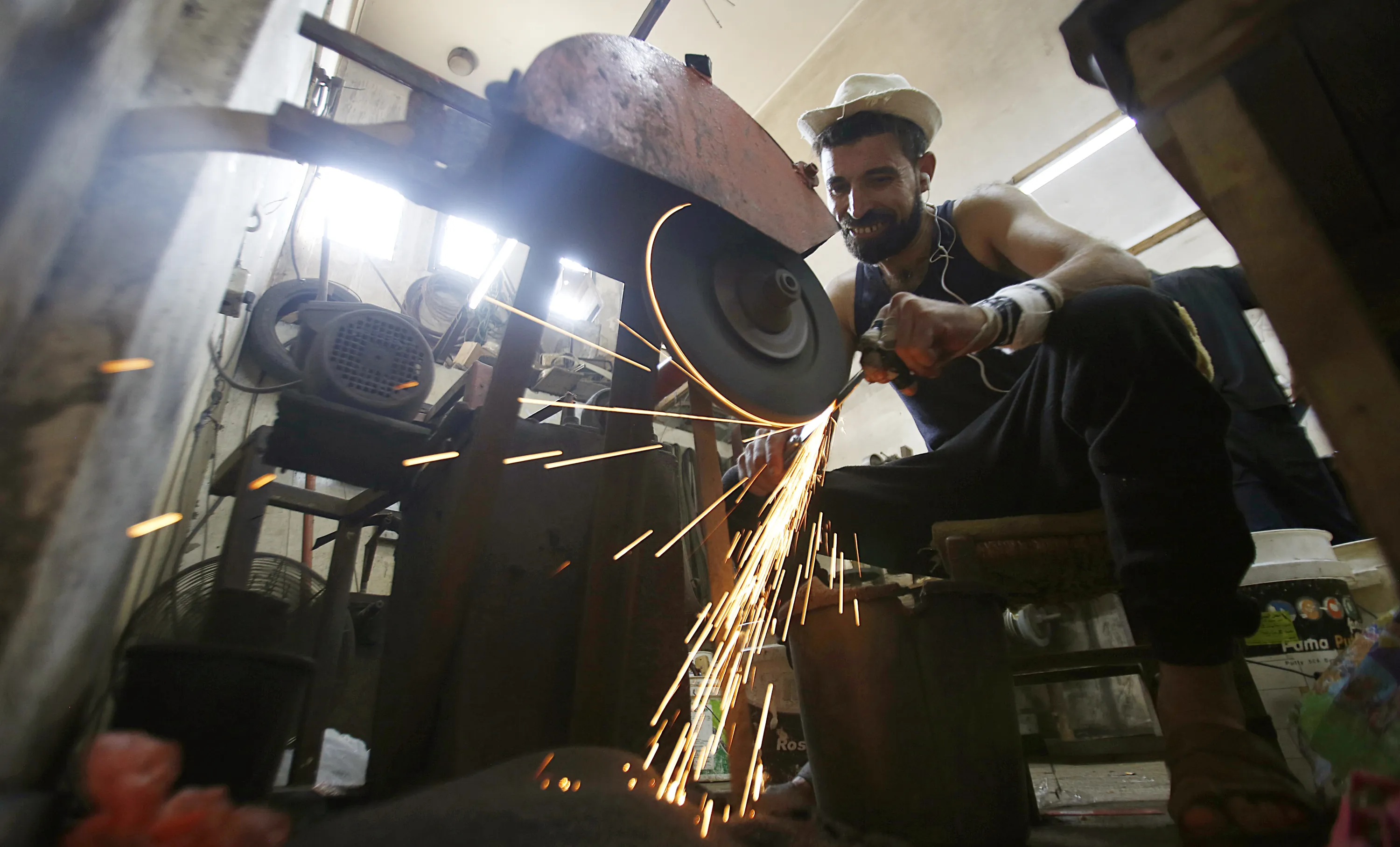 A Palestinian man sharpens a knife that will be used to slaughter cattle or cut meats during the Muslim festival of sacrifice Eid al-Adha, in a workshop in Gaza City, Tuesday, July 28, 2020. Eid al-Adha, or Feast of Sacrifice, Islam's most important holiday marks the willingness of the Prophet Ibrahim to sacrifice his son. (Photo by Hatem Moussa/AP Photo)