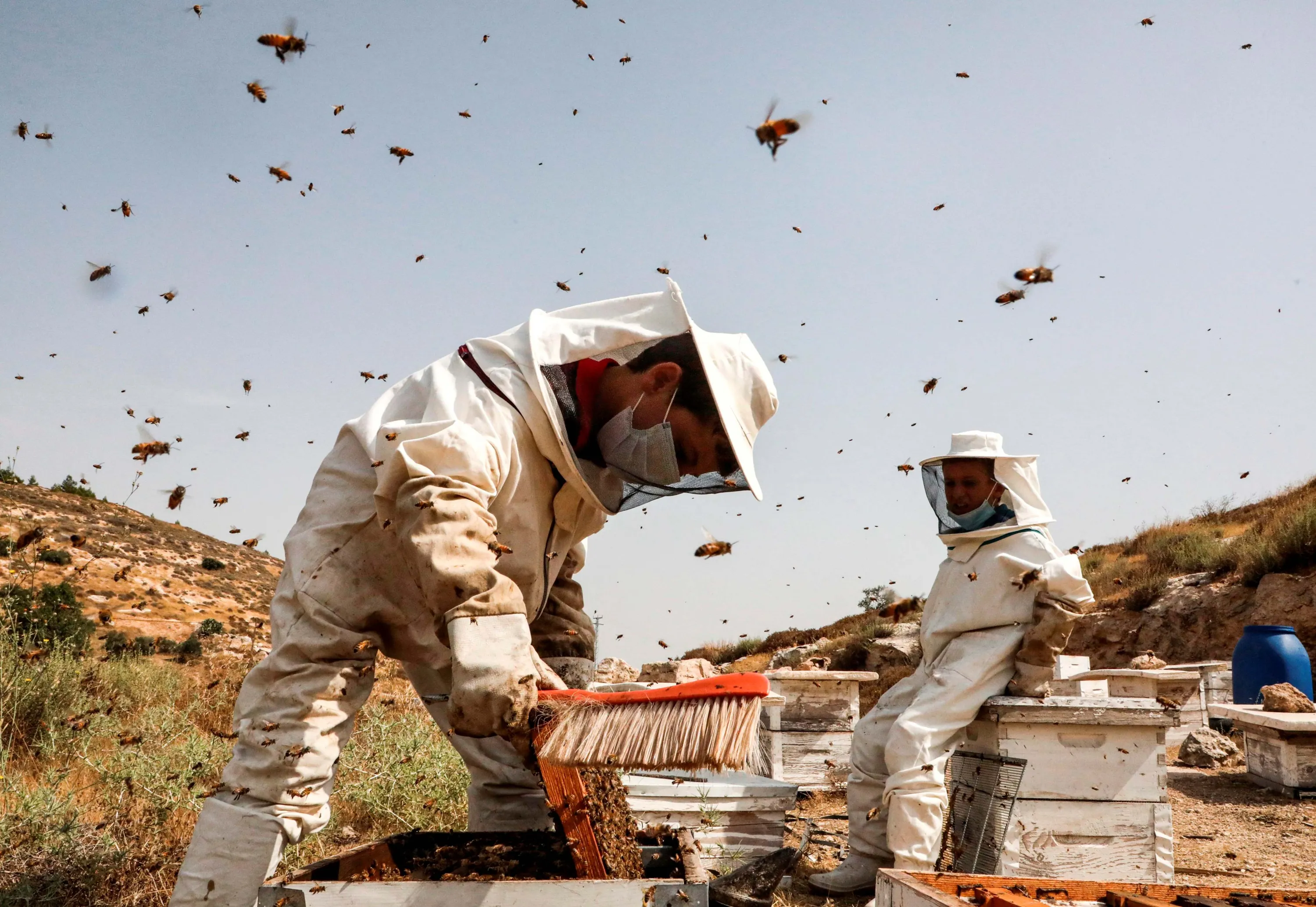 Palestinian boys work at their father's apiary in the village of Doura, west of Hebron in the occupied West Bank on July 28, 2020. (Photo by Hazem Bader/AFP Photo)