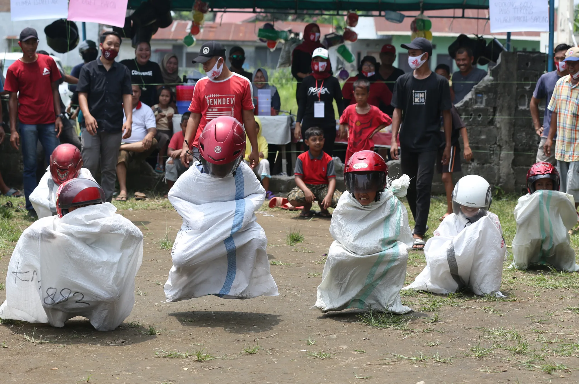 Children participate in a sack racing competition using helmets as face shields in anticipation of the spread of the novel coronavirus (COVID-19) pandemic during celebration of Indonesia's 75th Independence Day in Deli Serdang, North Sumatra, Indonesia on August 17, 2020. Various activities are held while still applying health protocols to curb the spread coronavirus. (Photo by Kiki Cahyadi/Anadolu Agency via Getty Images)