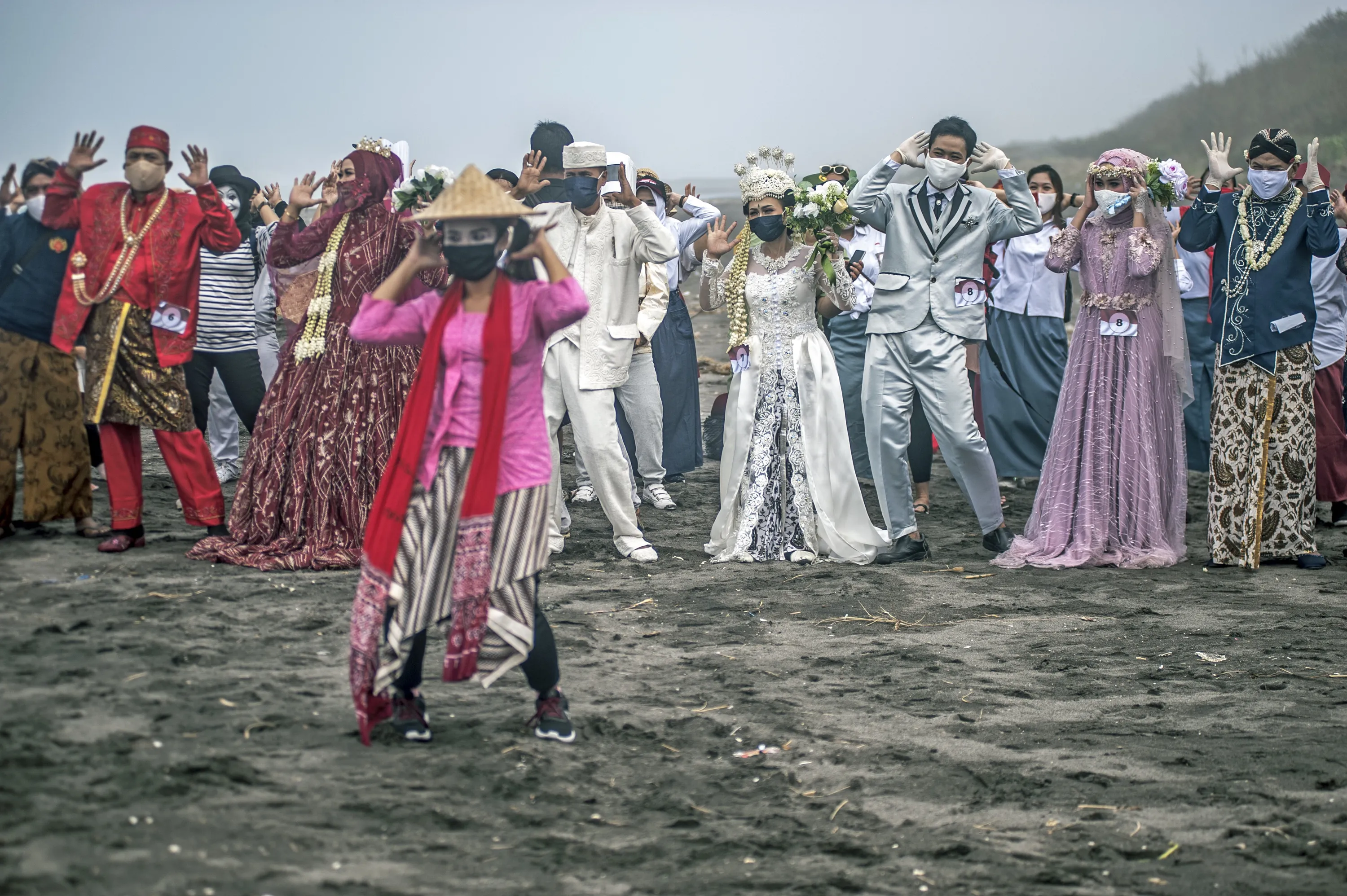 Brides and grooms dance during a mass wedding attended by 75 couples to commemorate the upcoming Indonesian Independence Day on August 17, at a field in Bantul, Yogyakarta on August 12, 2020. (Photo by Agung Supriyanto/AFP Photo)